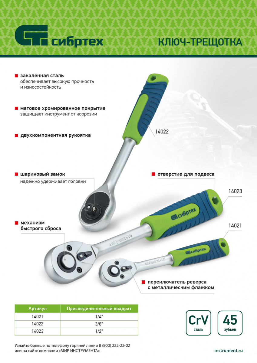 Ключ-трещотка Сибртех 14022 с присоединительным квадратом 3/8", функцией быстрого сброса и храповым механизмом с 45 зубьями, имеет покрытие «матовый хром» и используется с торцевыми головками, имеющими посадочное гнездо соответствующего размера. Предназначен для закручивания и раскручивания резьбового крепежа. Храповой механизм с 45 зубцами обеспечивает плавное вращение. Ключ применяется для ремонта автомобилей, техники и оборудования, пригодится также дома и на даче.