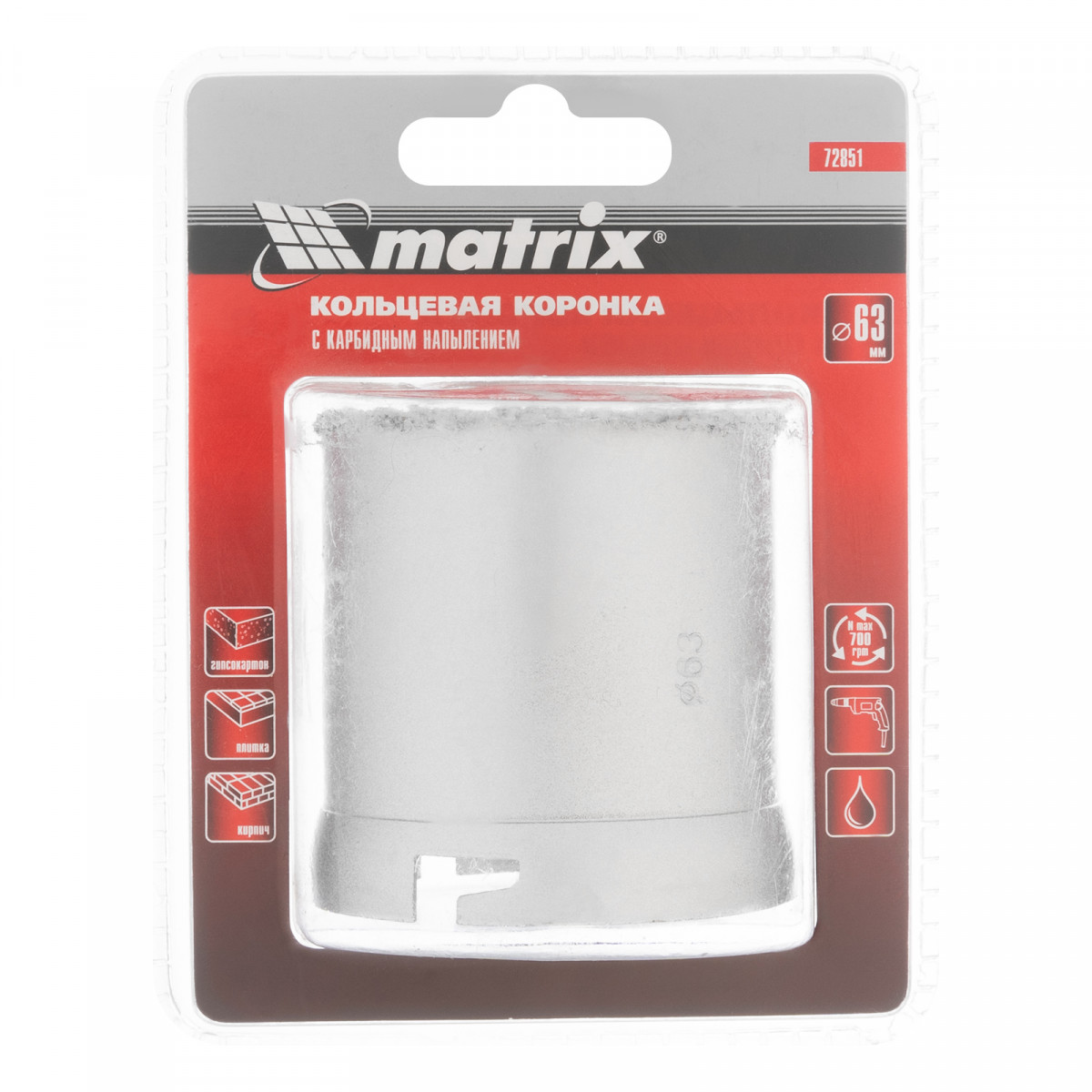Кольцевая коронка с карбидным напылением Matrix 72851 диаметром 63 мм — сменный режущий элемент для дрелей и перфораторов. Предназначена для сверления отверстий в керамической плитке, ячеистом бетоне, пенобетоне, газосиликате, кирпиче. Пригодится для монтажа проводки в доме. Используется совместно с державкой Matrix 72860 и центрирующим сверлом Matrix 72862 (не входят в комплект поставки).
