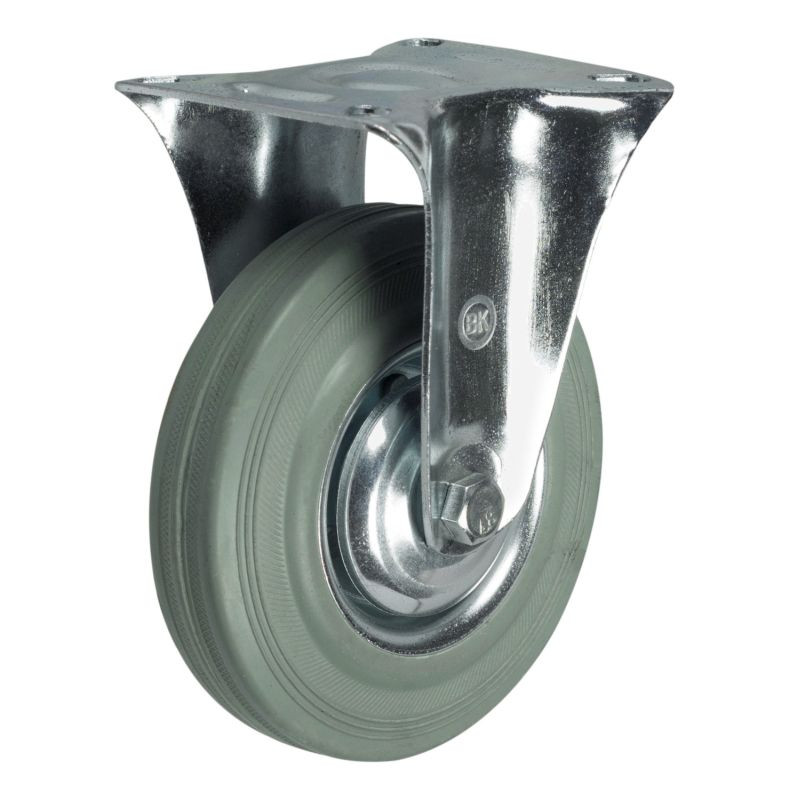 Шинка выполнена из полуэластичной серой резины, прессованный обод из листовой стали. Кронштейн опоры изготовлен из листового металла. Крепление осуществляется через 4 отверстия.Они используются на легких тележках для работы как внутри, так и вне помещений, на неровных поверхностях, полах с препятствиями, во влажной среде. Шина устойчива к механическим повреждениям и не оставляет следов на светлом полу склада.Температурный режим работы колесные опор - от -25°С до +50°С.