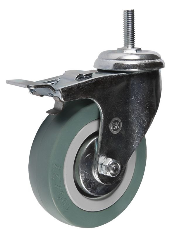 Колесо аппаратное SCtgb93 со штырем и тормозом относится к легкой серии колес. Ободная часть аппаратной колесной опоры со штырем и тормозом SCtgb93 изготовляется из серого полипропилена с двумя боковыми пыльниками, защищающими осевой механизм от повреждения посторонними веществами и пылью.Главной особенностью аппаратных колесных опор со штырем и тормозом SCtgb93 является термоэластичный контактный слой, не наделяющий следами любые поверхности пола. Благодаря отмеченным особенностям шинки, аппаратные колесные опоры со штырем и тормозом SCtgb93 используются для медицинских кроватей и других транспортных конструкций в помещениях с маркими полами, для аппаратуры, бытовой и офисной мебели, для медицинской техники и оборудования, металлической мебели, стеллажей, на тележки-"шпильки"для пищевых производств, для гостиничного оборудования и химчисток.В основе поворотного механизма аппаратной колесной опоры SCtgb93 находится двухрядный шариковый подшипник. В оси колесной опоры аппаратного типа с креплением со штырем применена втулка скольжения. Аппаратные колесные опоры со штырем и тормозом SCtgb93 обладают типовым креплением: отвести предназначенной для вхождения крепежного болта.Термические условия эксплуатации аппаратных колесных опор находятся в рамках от - 20°С до +50°С. Максимальная грузоподъемность колеса SCtgb93 – 45 кг.
