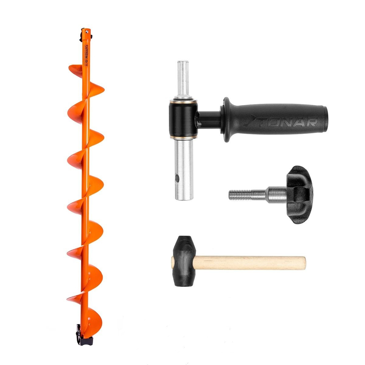 Комплект под мотобур состоит из шнека MOTOSHTORM 130R с правым вращением, адаптера АШ-02 и прорезиненного молоточка.