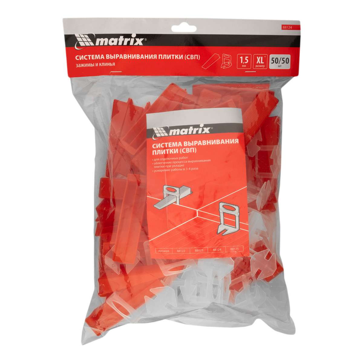 Система выравнивания плитки (СВП Ворота XL) Matrix 88124 включает в себя все необходимое: зажимы и клинья (50/50 шт. в пакете) для керамической и керамогранитной плитки толщиной 4-13 мм. СВП предотвращает смещение плитки и гарантируют получение идеально ровных, аккуратных швов. Предназначена для формирования швов толщиной 1,5 мм.