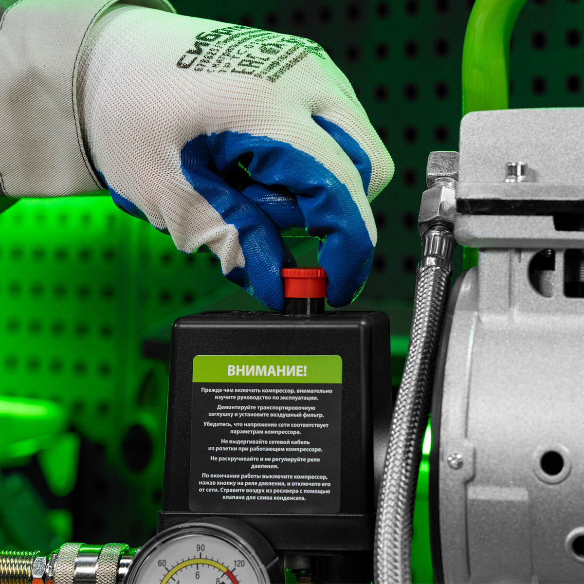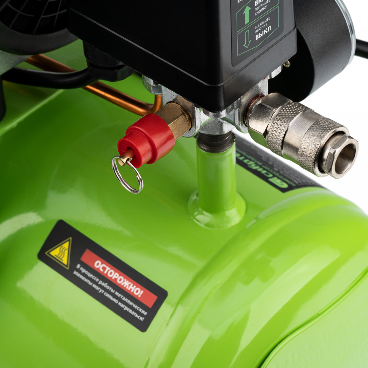 • Контроль рабочих параметров — компрессор оборудован механическим манометром для отслеживания давления.