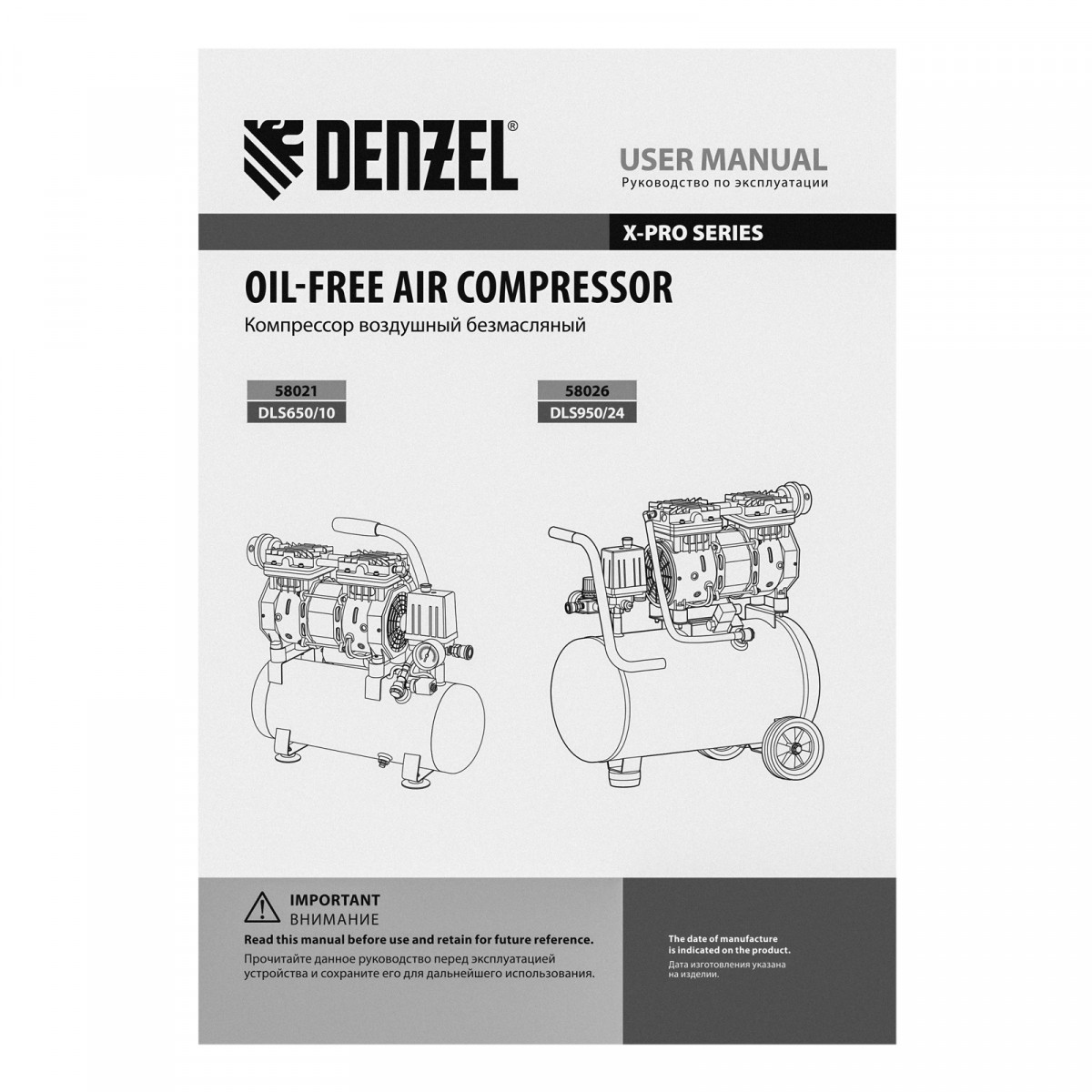 Компрессор DLS950/24 безмаслянный малошумный 950 Вт, 165 л/мин, ресивер 24 л Denzel