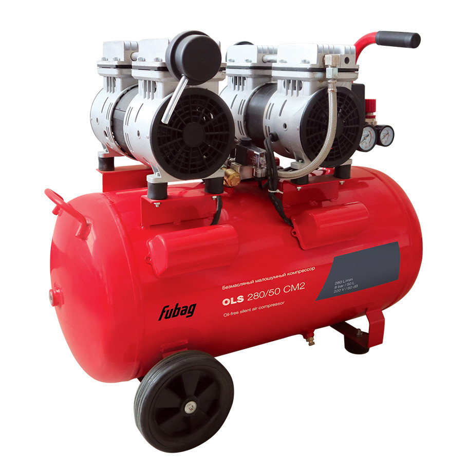 - Безмасляный малошумный компрессор FUBAG OLS 280/50 CM2 31381 отличается мобильностью