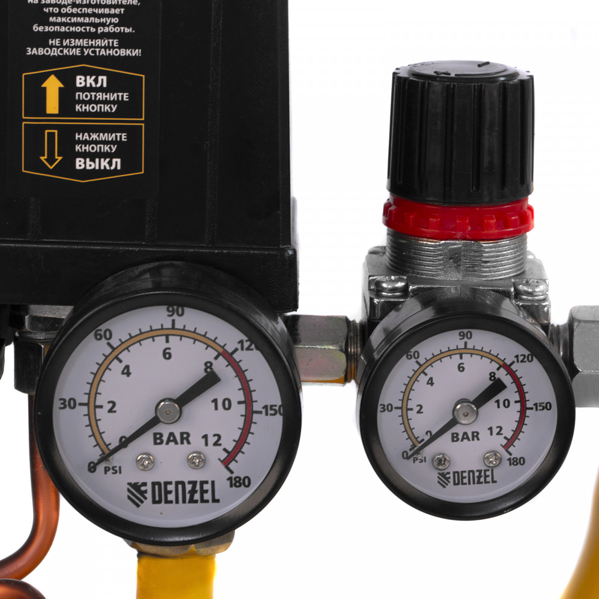 - Автономность — реле давления обеспечивает остановку компрессора по достижении максимального рабочего давления 8 бар и автозапуск при падении давления в ресивере ниже 5,5 бар.