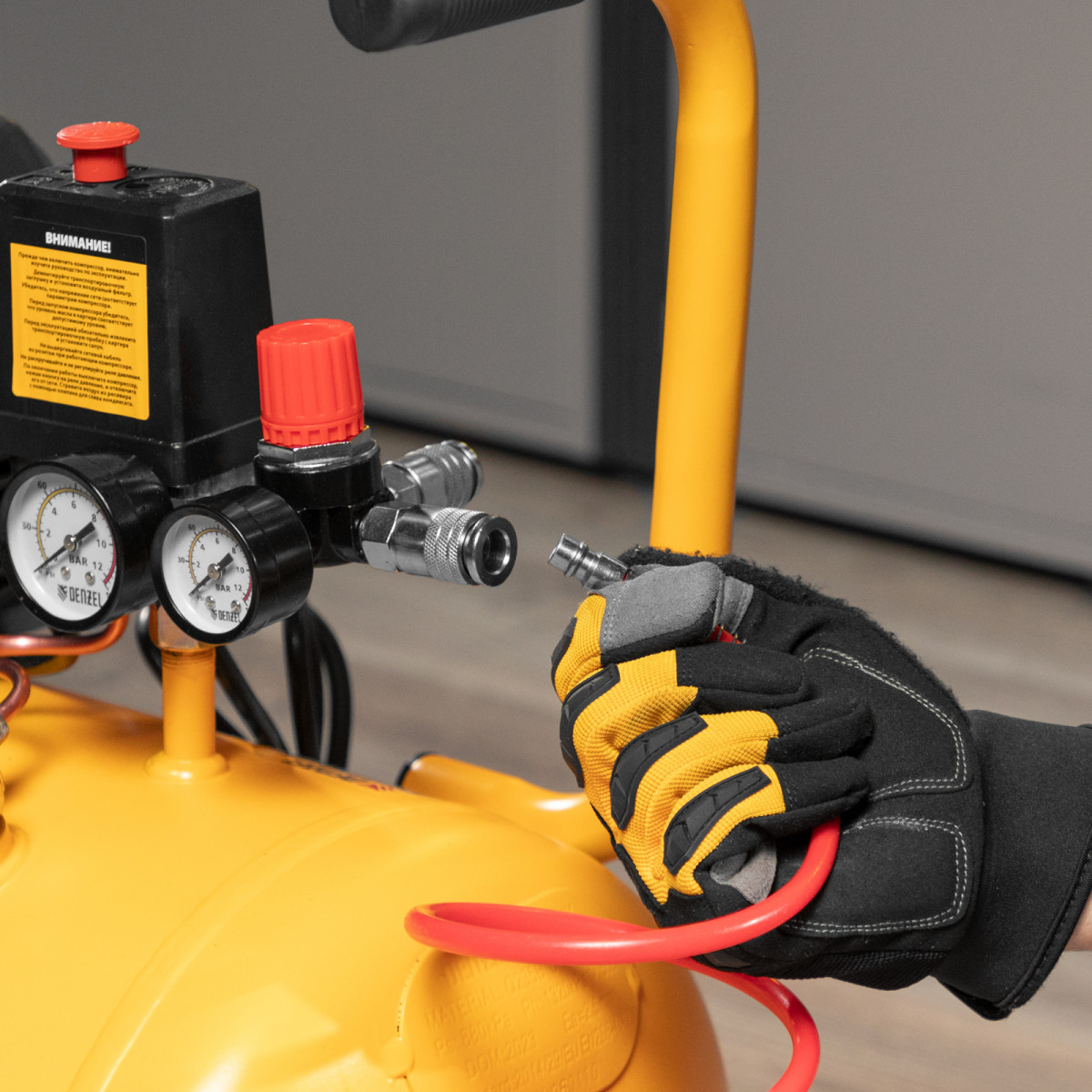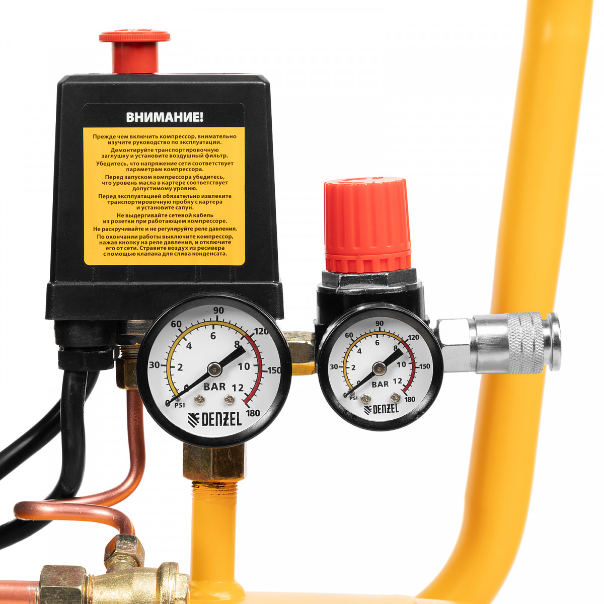 • Контроль рабочих параметров — два манометра отображают давление в ресивере и выходной магистрали.