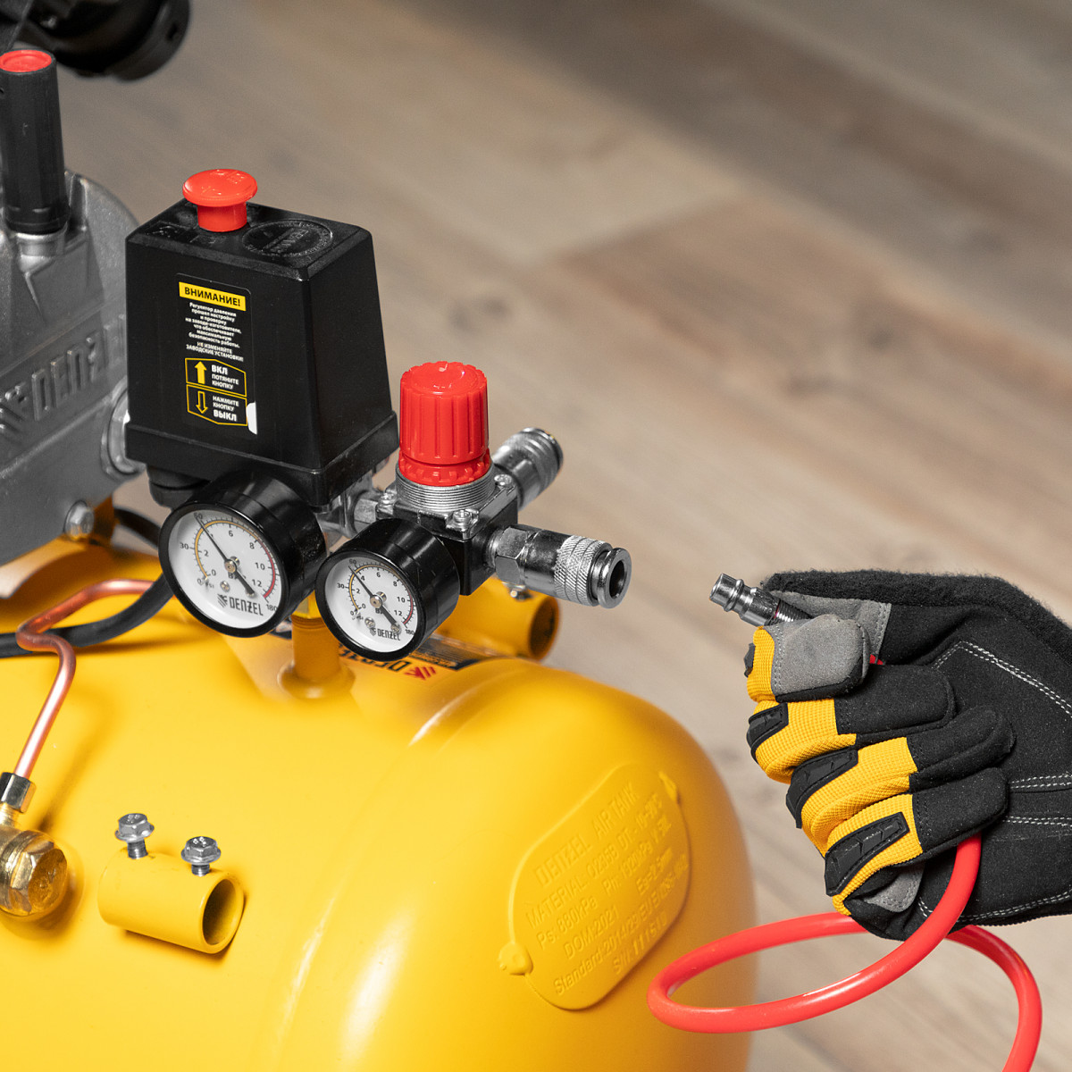 • Контроль рабочих параметров — 2 манометра облегчают отслеживание давления в ресивере и пневмомагистрали.