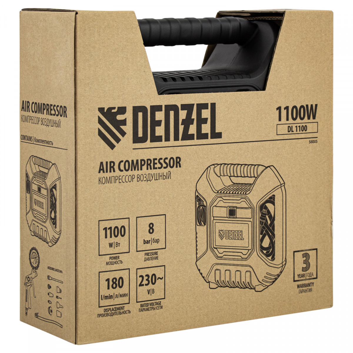 Компрессор воздушный DL1100 1.1 кВт, 180 л/мин, с набором аксессуаров Denzel