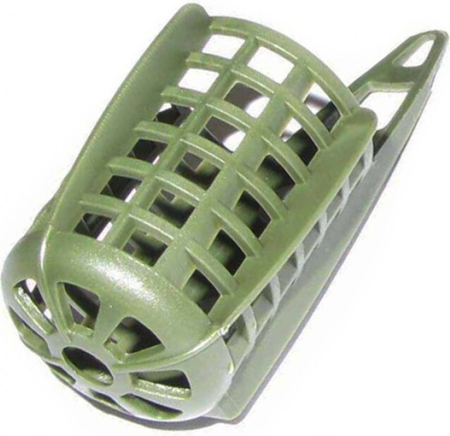 Кормушка для ловли рыбы со дна с использованием прикормки. Кормушка изготовлена из пластика и оснащена грузом из свинца. Обладает аэродинамической формой, что позволяет делать дальние забросы. В ассортименте представлены кормушки как для ловли в стоячей воде, так и на течении. Краткие характеристики: диам.35мм/дл.58мм/вес 80г