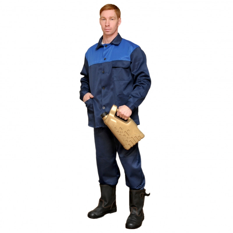 Костюм состоит из куртки и брюк. Самый просто и не дорогой вариант спецодежды.Куртка прямого силуэта, с центральной застежкой на пуговицы, с накладными карманами. Воротник отложной, рукав втачной с манжетами, застегивающимися на пуговицу.