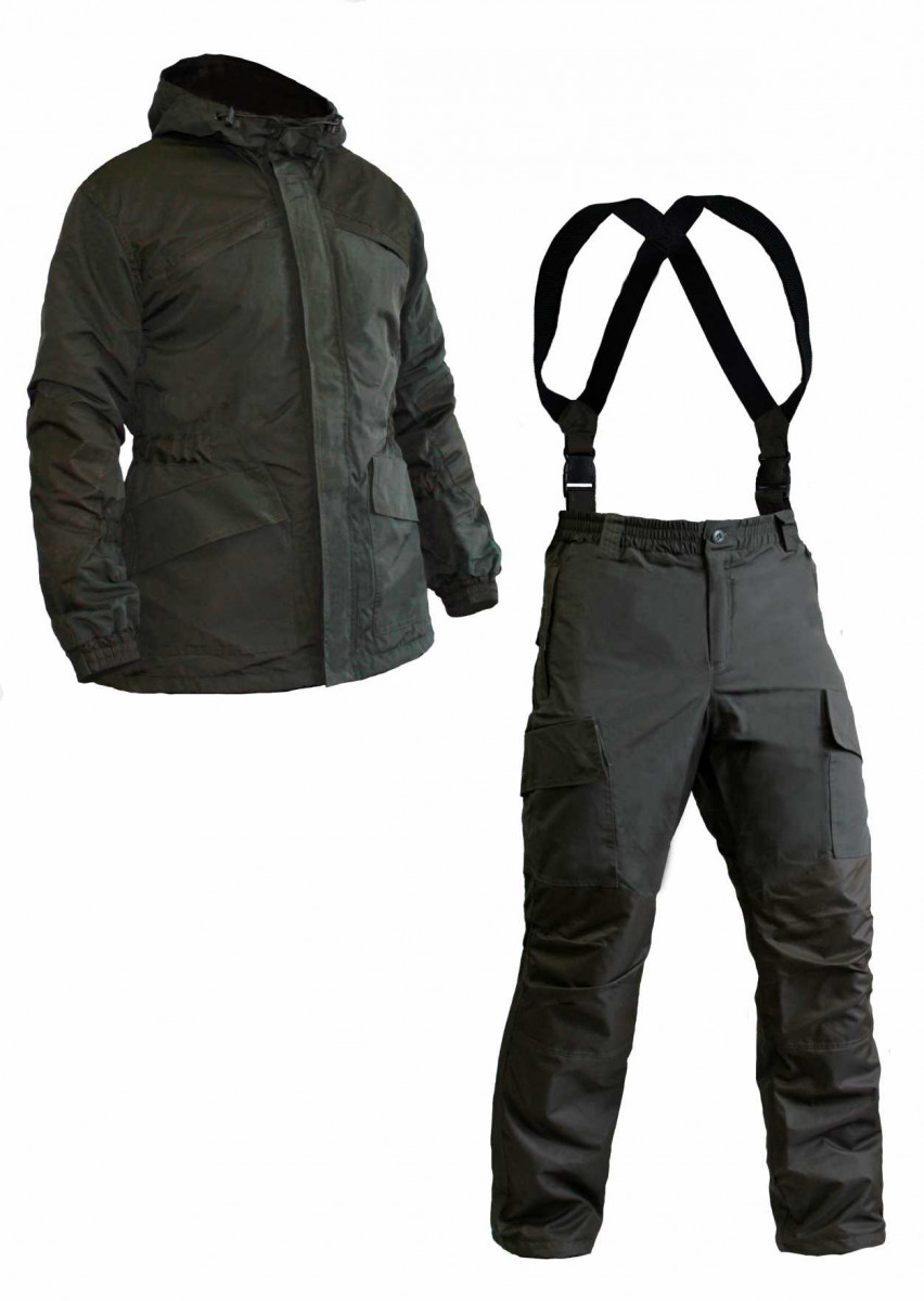 Куртка с флисовой подкладкой. Центральная застежка-молния с ветрозащитным клапаном на кнопках, регулируемый капюшон. Два нагрудных кармана на молнии, два накладных кармана с клапаном, накладной карман на рукаве, внутренний нагрудный карман на молнии. Анатомический крой рукава в области локтевого сгиба с эластичной лентой. Брюки с поясом на эластичной ленте со шлевками. Гульфик на застежке-молнии. Два боковых кармана на молнии и два накладных с клапаном. Анатомический крой в области колена. Бретели из эластичной ленты для фиксации брюк на талии.