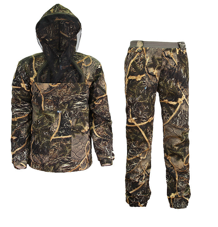 Костюм выполнен из ткани RIP-STOP (20% хлопок, 80% полиэстер и состоит из куртки-анорака и брюк. Ткань имеет водоотталкивающую пропитку. Костюм предназначен для защиты от кровососущих насекомых, имеет антимоскитную сетку. Крой костюма – свободный. Костюм собирается только армированной нитью.