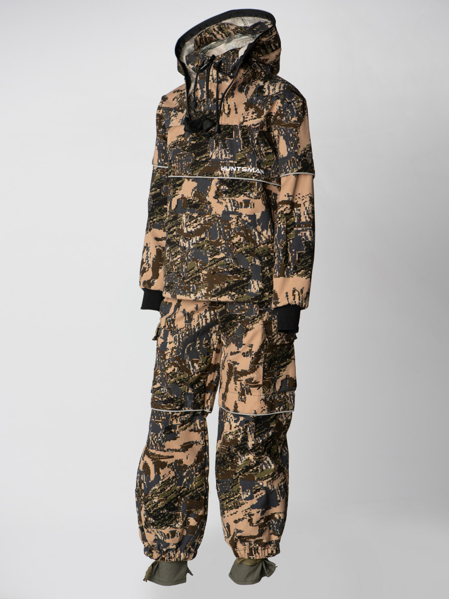 Особенности модели: низ куртки с утяжкой, рукава с эластичными манжетами из рибаны. резинка по поясу и низу брюк, функциональные объемные карманы с клапанами на брюках, низ брюк на резинке, полная защита от гнуса, клещей, маскировочные цвета.