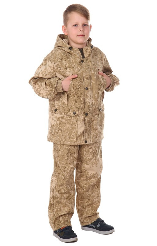 Детский костюм летний Ветерок выполнен из смесовой ткани камуфляжной светлой песчаной расцветки D16. Комплект одежды состоит из брюк и куртки.
