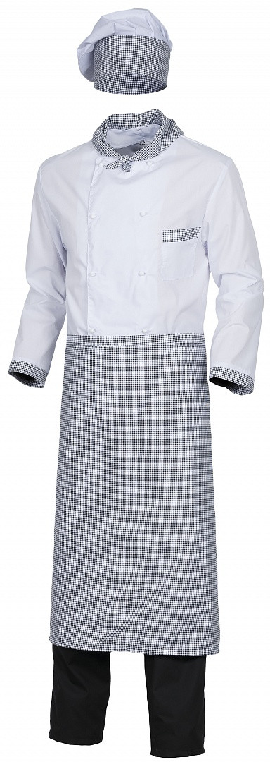 Куртка с одним накладным карманом, длинным рукавом Колпак, низ рукава и карман декорируются контрастной тканью в цвет передника (клетка).
