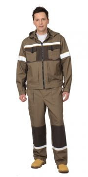 Описание: Куртка прямого силуэта укороченная с удлиненной фигурной спинкой, с центральной застёжкой на тесьму-молнию, воротником стойкой и капюшоном, пристёгивающимся на молнию. Верхними накладными и нижними накладными полуобъёмными карманами на молнии. Ширина куртки по низу регулируется хлястиком на липучке. Брюки с притачным поясом, с застёжкой гульфика на молнию. В области боковых швов вставлена резинка для регулировки объёма. Брюки с задними накладными карманами, с усилительными наколенниками. В костюме размещены СО полосы 25 и 50 мм, а также кант (оранжевый) для обеспечения безопасности работы в условиях пониженной видимости.