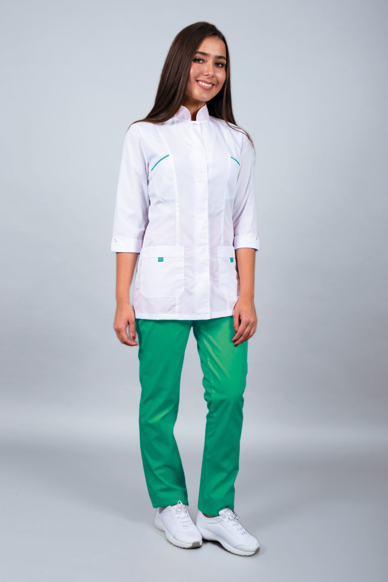 БЛУЗОН: -медицинский женский прилегающего силуэта -длинной до линии бедер -отделка из отделочного материала по стойке и карманам -центрально-бортовая супатная застежка на 5-6 кнопок -объемная часть полочки и спинки образована рельефными швами, проходящими от линии плечевого шва до низа изделия -на полочке два маленьких нагрудных кармана, втачанных в рельефы и два нижних накладных кармана -рукава втачные одношовные, длинной ? -нижний край рукава обработан манжетой -воротник – стойка БРЮКИ: -медицинские женские -зауженные к низу -пояс обработан на поясной машине