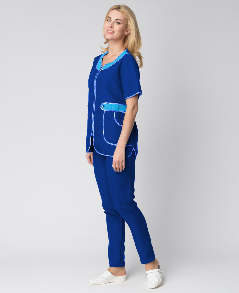 -КУРТКА: -укороченная, прямого силуэта с коротким рукавом и центральной застежкой на молнии -фигурный вырез горловины и верхний срез карманов декорированы отделочными деталями из контрастной ткани -спинка прямая без отделки, с двумя полупоясами для регулировки объема -все срезы костюма окантованы капроновым кантом -для увеличения прочности куртки выполнено дополнительное усиление швов центральной застежки БРЮКИ: -прямые -на резинке