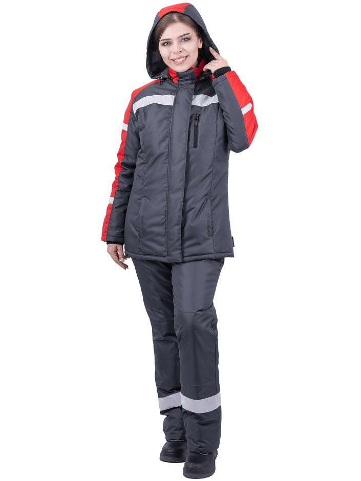 Ткань верха: «Оксфорд 240Т», PU-отделка Состав: 100% полиэфир, плотность 130 г/м² Костюм состоит из куртки и полукомбинезона. Куртка: • центральная застежка на молнию • ветрозащитная планка с текстильной застежкой • воротник-стойка • нагрудный карман с застежкой-молнией • нижние карманы с листочкой • внутренний карман • внизу рукава внутренняя трикотажная манжета • пристегивающийся капюшон на молнии с регулировкой объёма • световозвращающие полосы по линии кокетки полочки, спинки шириной 50 мм, по рукавам – 25 мм Полукомбинезон: • застёжка на двухзамковую молнию • бретели с эластичной тесьмой и с застёжкой на фастексы • объём спинки регулируется по линии талии эластичной лентой • боковые карманы с наклонным входом на передних половинках • прорезной нагрудный карман с застежкой на молнию • наколенники • световозвращающие полосы 50 мм