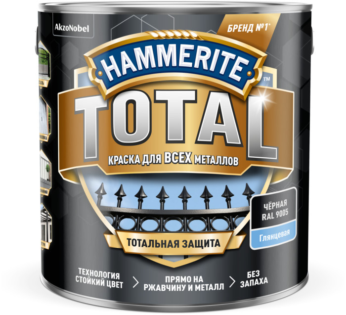 Краска Hammerite Total глянцевая чёрная RAL 9005 0,75л