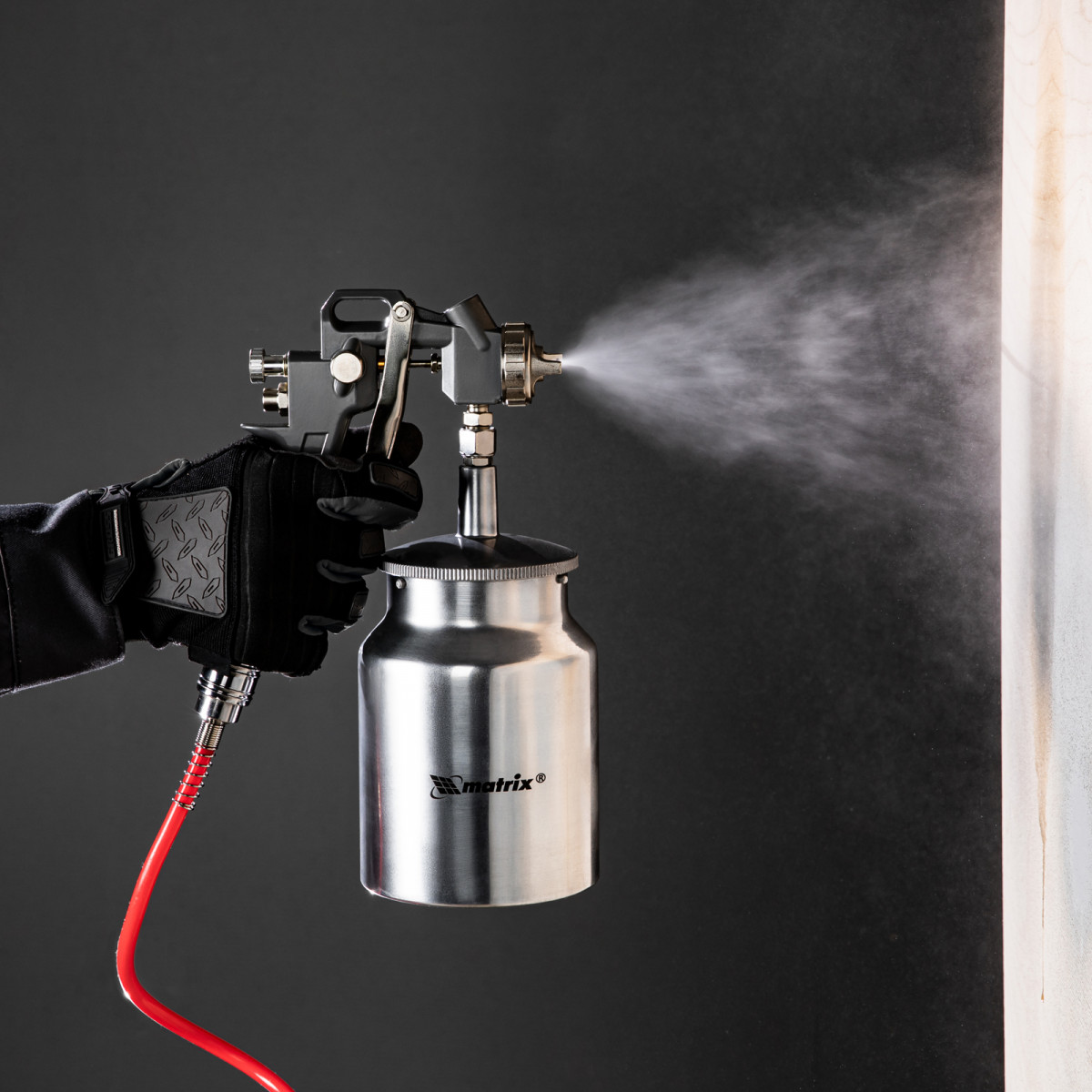• Нижнее расположение бака — краскораспылитель можно ставить на горизонтальные поверхности, также он не загораживает обзор в процессе работы.