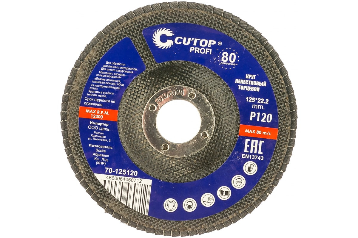 Круг наждачный лепестковый Cutop 70-125120 используется для профессионального и повседневного использования. Абразивный материал - кальценированный оксид алюминия, 80 лепестков, угол наклона 10 градусов, 100% КПД, повышенная износостойкость.