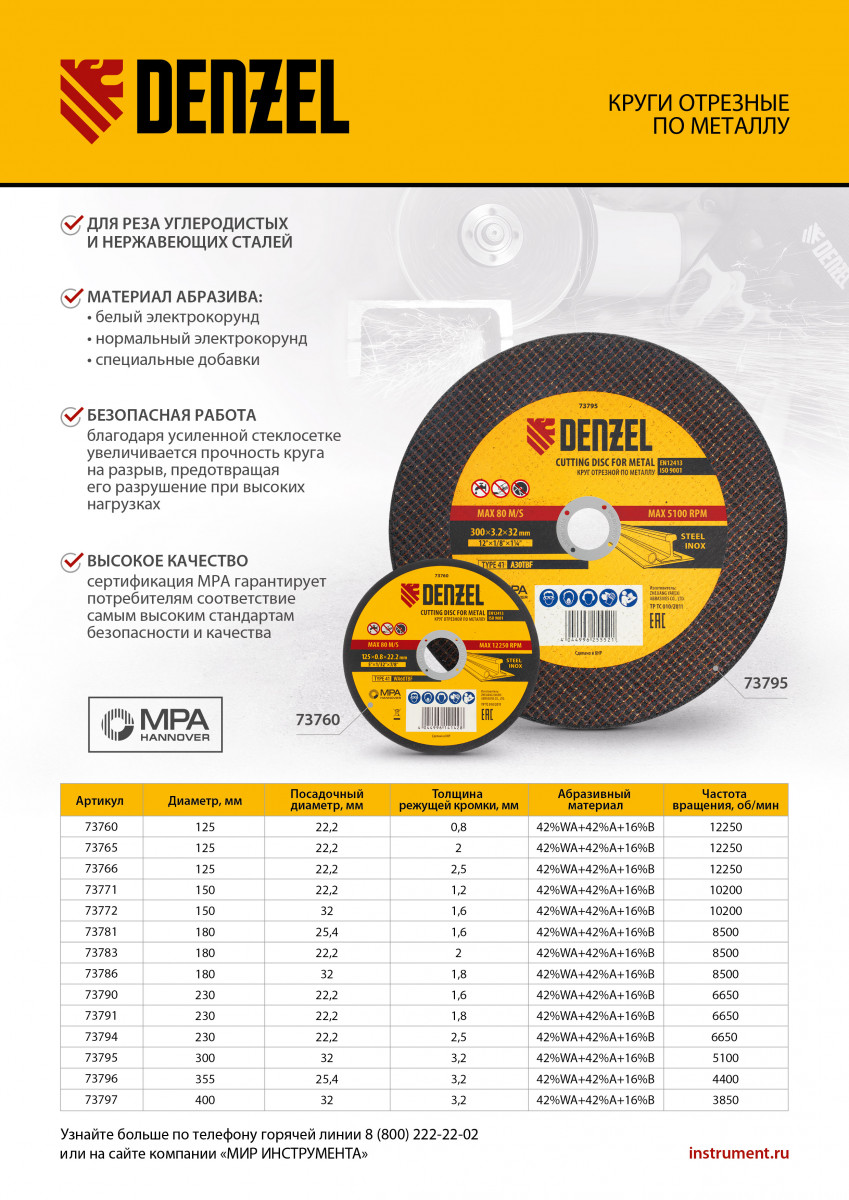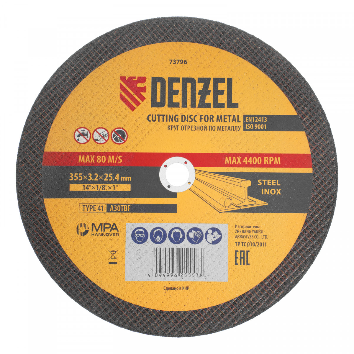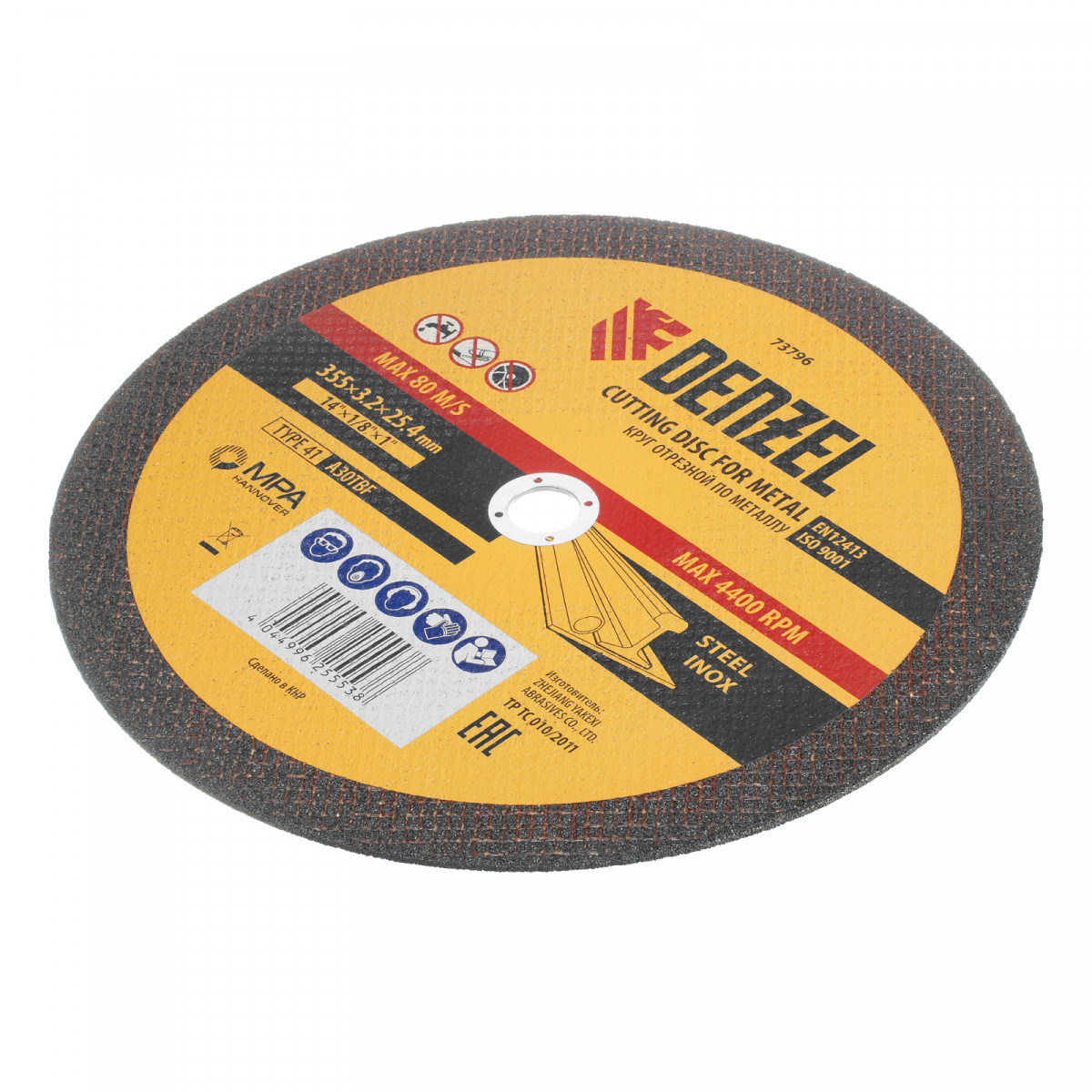 Отрезной круг по металлу Denzel A30TBF 73796 диаметром 355 мм и толщиной 3,2 мм устанавливается на углошлифовальную машину или станок с посадочным размером 25,4 мм. Предназначен для интенсивного сухого резания углеродистой и нержавеющей легированной стали. Максимальная частота вращения составляет 4400 об/мин. Круг можно использовать не только в быту, но и для решения профессиональных задач.