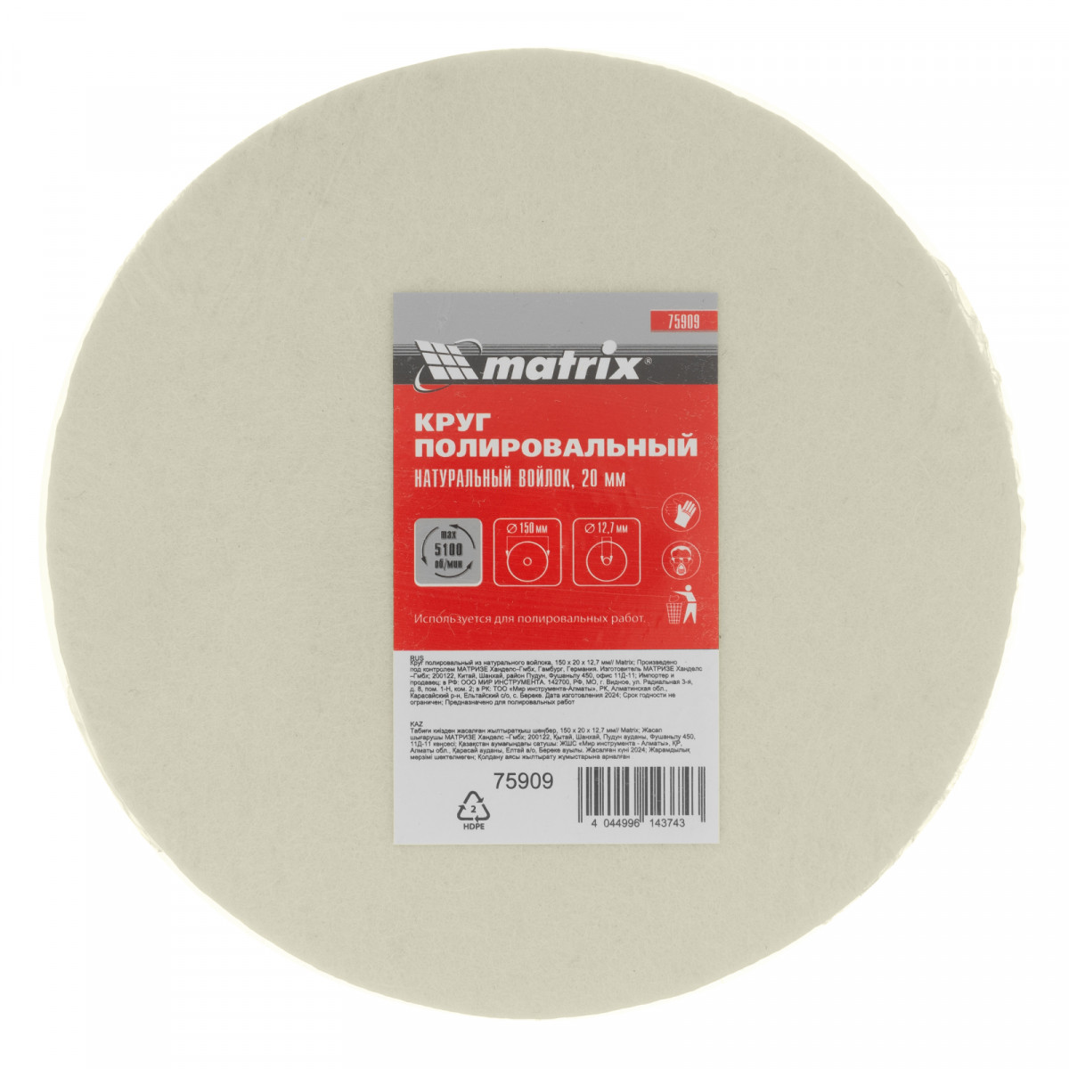 Круг полировальный из натурального войлока, 150 х 20 х 12.7 мм Matrix