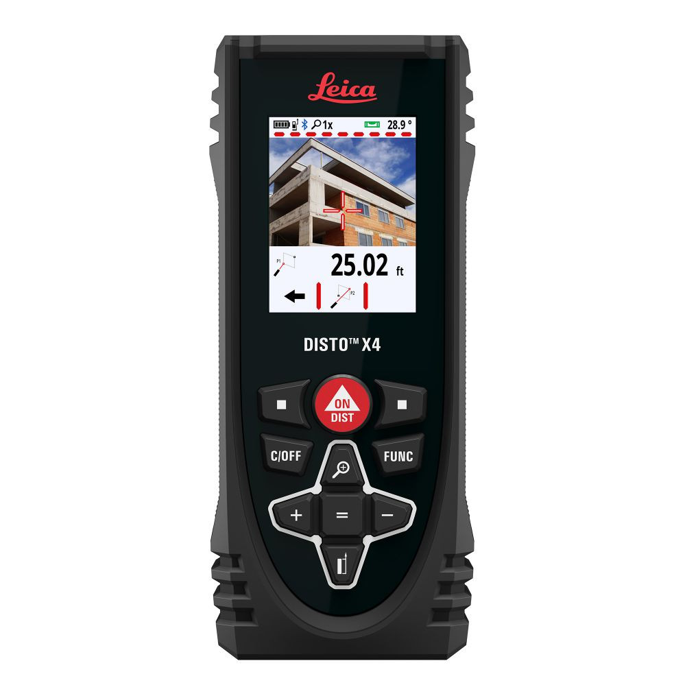 Лазерный дальномер Leica Disto X4 – это профессиональный прибор, который позволяет с высокой точностью измерять и вычислять линейные расстояния. Он предназначен для эксплуатации в самых сложных условиях и дает возможность работать на открытой площадке в условиях яркого освещения, когда лазерная точка дальномера не видна на поверхности. Прибор позволяет выполнять измерения на расстоянии от 50 мм до 150 м. Погрешность при определении расстояний не превышает 1 мм. Кроме того, дальномер Leica Disto X4 оснащен датчиком наклона. Благодаря ему можно выровнять дальномер и исключить погрешность при определении расстояния, а также вычислить высоту объекта на основе длин двух сторон треугольника и углу между ними. Устройство позволяет автоматически строить планы помещения. Для этого достаточно установить его на штатив и вращать вокруг своей оси. Дальномер автоматически выполнит замеры и построит на их основе точный план комнаты с соблюдением всех необходимых замеров.