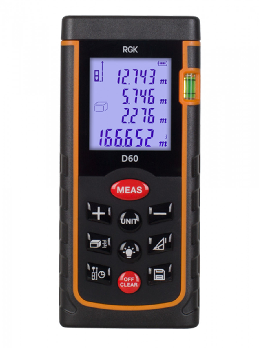 Лазерный дальномер RGK D60 — улучшенная модель рулетки D60 в новом корпусе, со встроенным пузырьковым уровнем и расширенным функционалом. Основные преимущества RGK D60 Точность и надёжность При максимальной дистанции в 60 метров точность измерений составляет не менее ±2 мм. Это позволяет использовать дальномер RGK D60 в ответственных работах, например, при строительстве, разметке территории, в геодезии и т.п. Встроенный в корпус пузырьковый уровень обеспечит уверенные измерения с рук и поможет ровно установить дальномер на штативе. Функциональность Большой набор функций превращает дальномер RGK D60 в универсальный инструмент 3 в 1, заменяющий рулетку, калькулятор и блокнот для записей. Арифметические вычисления — расчёт площади и объёма с сохранением промежуточных замеров на экране, сложение и вычитание результатов прямо в процессе измерений. Расчёт по Пифагору — определение длины путём косвенных измерений. Помогает рассчитать недоступные расстояния, например, высоту дома или участка стены. Измерение зада