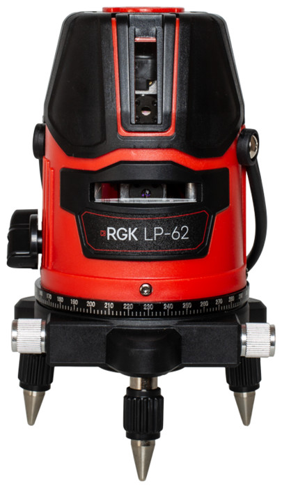 Лазерный уровень RGK LP-62 – современный построитель плоскостей, предназначенный для разметочных работ внутри помещения. Видимая дальность действия лазера составляет 20 метров с точностью ±0,2мм/м. Функциональные характеристики лазерного нивелира RGK LP-62 позволяют использовать его для проведения большинства разметочных и монтажных и отделочных работ: Установка оконных и дверных проемов. Монтаж навесных потолков. Укладка плитки. Выравнивание полов. Установка гипсокартонных перекрытий и так далее. При включении прибора проецируется одна яркая горизонтальная плоскость с углом развертки 110°. Используя функциональные клавиши на верхней панели лазерного уровня RGK LP-62 вы можете активировать одну или две вертикальных плоскости – 120°. Крест, образующийся при пересечении двух вертикальных линий можно использовать в качестве зенита. В сочетании с точкой надира, которая проецируется лазерным отвесом это обеспечивает возможность переноса точек разметки с пола на потолок. Хорошая видимость луча лазерного нивелира