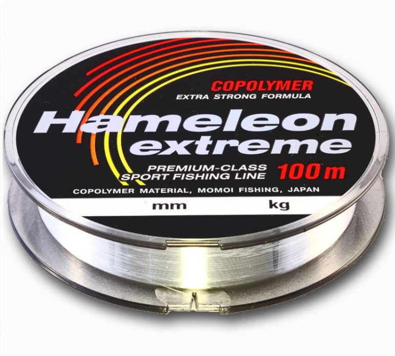 Рыболовная леска Hameleon Extreme от японской компании Momoi Fishing разработана для экстремальных условий. Повышенная прочность на узле позволяет выдерживать длительные нагрузки. Специальное абразивное покрытие увеличивает износоустойчивость лески. Специальное покрытие Hameleon (хамелеон) снижает видимость лески в воде.