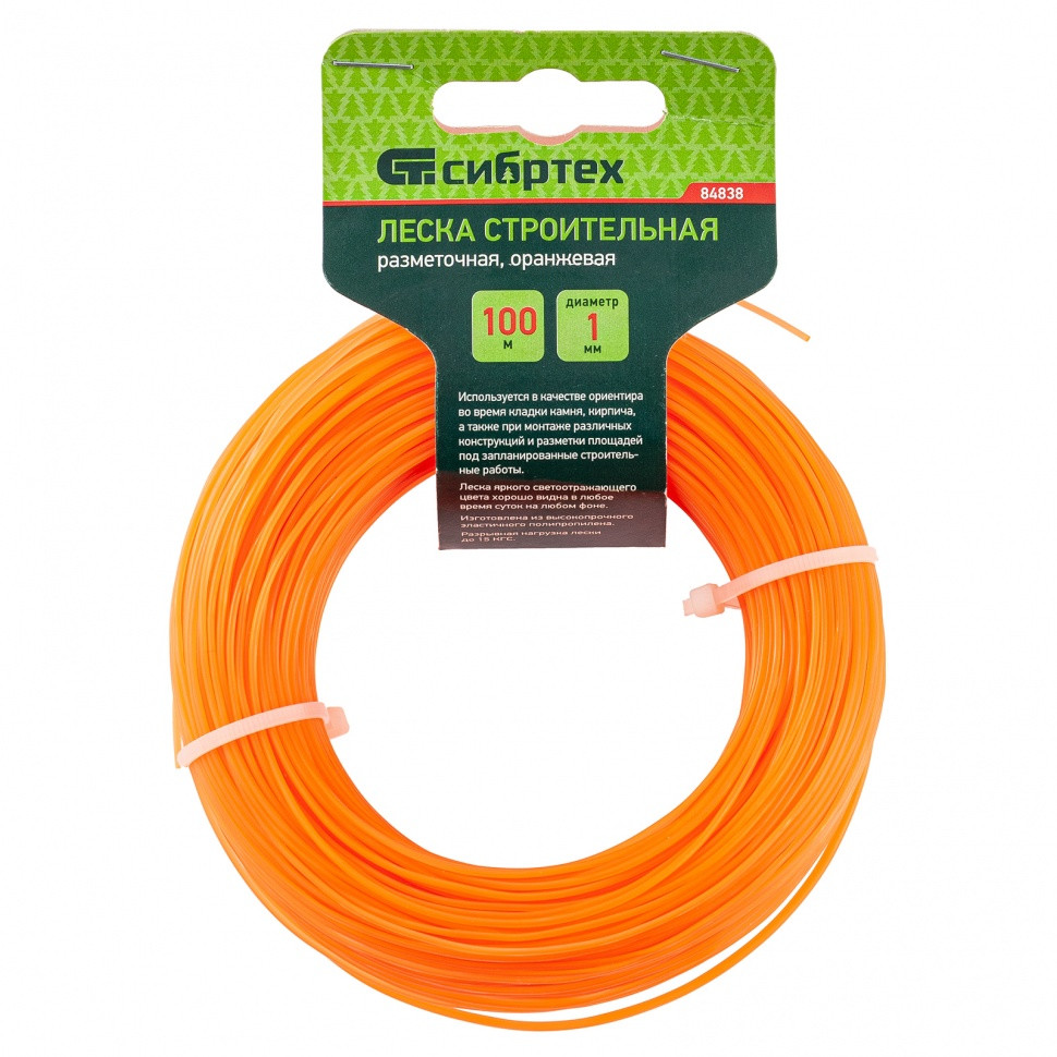 Леска строительная Сибртех 84838, длина 100 м, диаметр 1 мм, оранжевого цвета, пригодится на строительной площадке как ориентир при укладке материалов, установке конструкций.