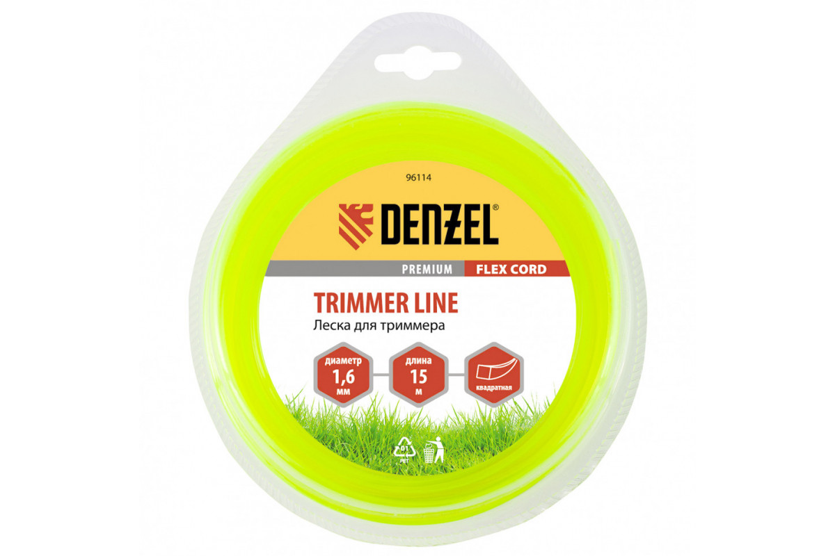 Леска для триммера Denzel FLEX CORD 96114 с квадратным сечением, диаметром 1,6 мм и длиной 15 м, поставляется в блистере и рассчитана на скашивание газонной, высокой или сухой травы. Используется с электротриммерами малой мощности (300-600 Вт) с нижним расположением двигателя.
