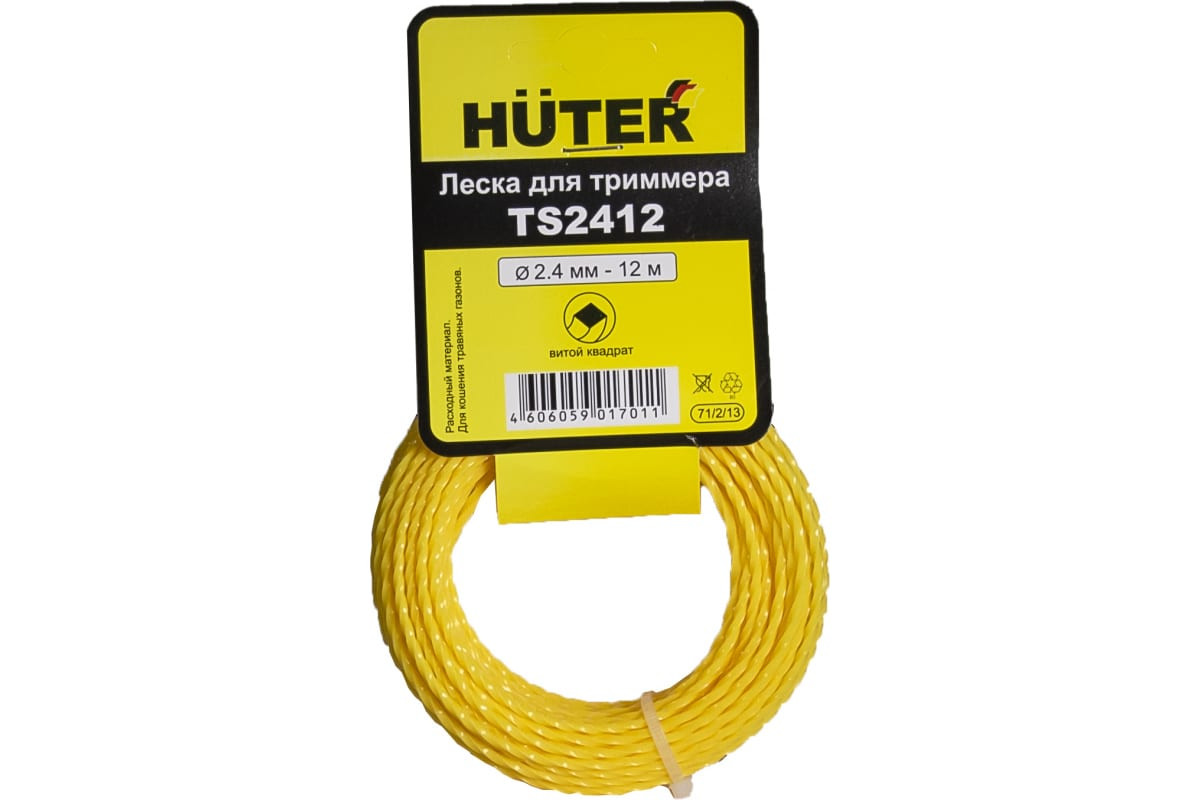 Леска Huter TS2412 с сечение в форме витого квадрата, диаметр 2,4 мм, длина 12 м. Подходит для триммеров: