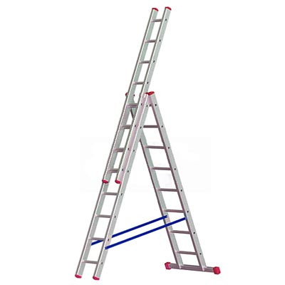 Профессиональная алюминиевая трехсекционная лестница выдержит большие нагрузки благодаря уникальной конструкции рамы, широкой траверсе, которая обеспечивает устойчивость всей конструкции. Специальный рельеф ступеней препятствует скольжению при использовании лестницы. Лестница снабжена самозахватывающими фиксирующими крюками, которые препятствуют самопроизвольному рассоединению секций.Особенности: