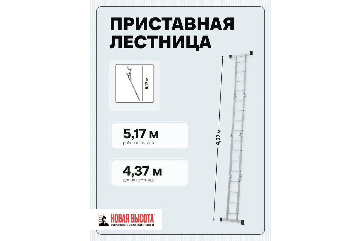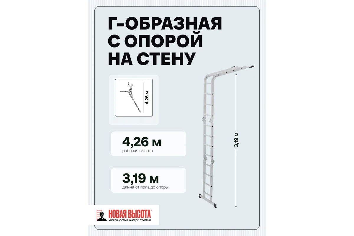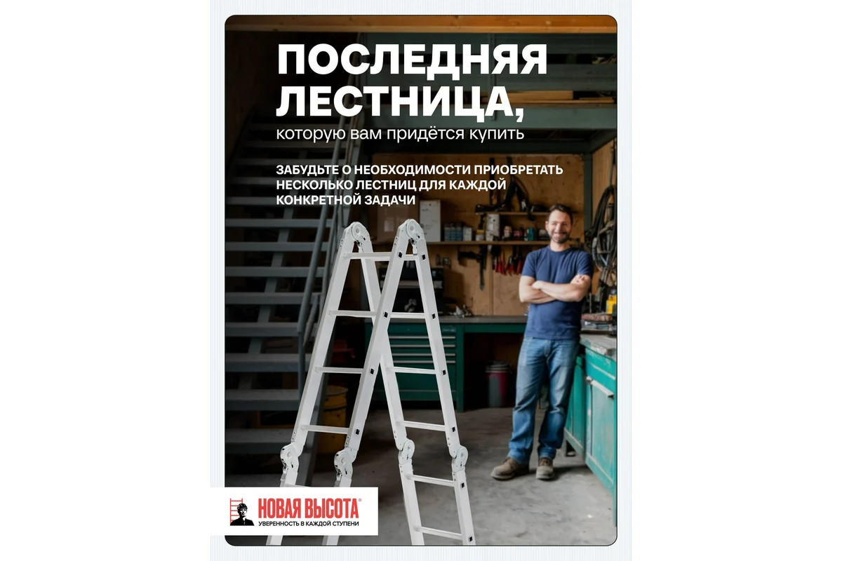 Четырехсекционная лестница-трансформер Новая Высота 4х4 ступени отлично подойдёт для ремонтных работ. Многофункциональность. Лестница легко преобразуется в помост, стремянку, приставную лестницу, приставную согнутую лестницу. Качество. Модель оснащена стойками с дополнительным усилением в наиболее нагруженных местах для повышения жесткости. Удобство. Шарнирные замки регулируются одной рукой. Долговечность. Благодаря многократной развальцовке в соединении ступеней со стойками изделие имеет долгий срок службы.