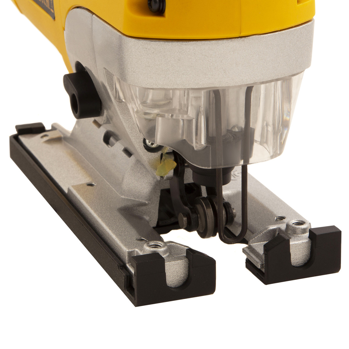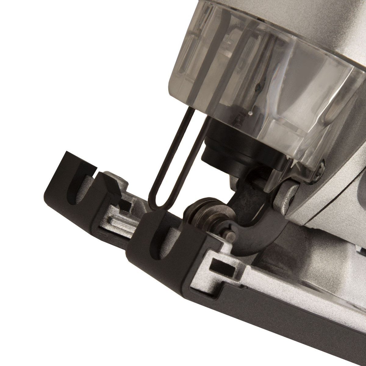 • Полная комплектация — лобзик поставляется с направляющей, пилками по дереву и металлу, шестигранным ключом, адаптером для подключения пылесоса и запасными угольными щетками.