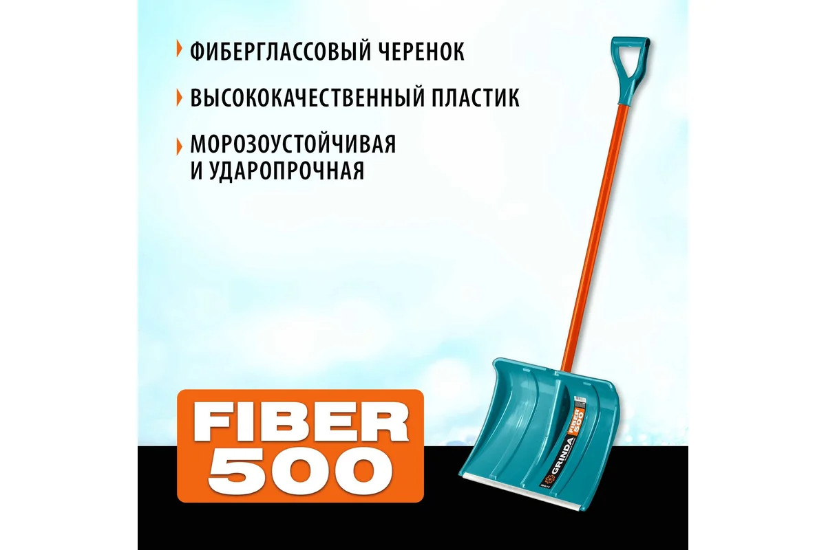 Пластиковая снеговая лопата Grinda PROLine Fiber-500 500 мм 39940 подходит для очистки территории от снега. Этот высококачественный инструмент создан специально для работы в холодное время года и сочетает в себе продуманную функциональность и продолжительный срок службы. Надежность. Рабочая часть лопаты изготовлена из морозоустойчивого ударопрочного пластика и имеет алюминиевую окантовку, защищающую кромку рабочей поверхности от повреждений. Эргономичный стеклопластиковый черенок с v-образной рукояткой обеспечивает удобство использования. -Особо прочный и одновременно легкий фибергласовый черенок. -Позволяет комфортно работать на морозе без перчаток. -V-образная рукоятка для удобства работы. -Ковш из высококачественного пластика, морозоустойчивый и ударопрочный. -Ковш дополнительно усилен алюминиевой планкой.