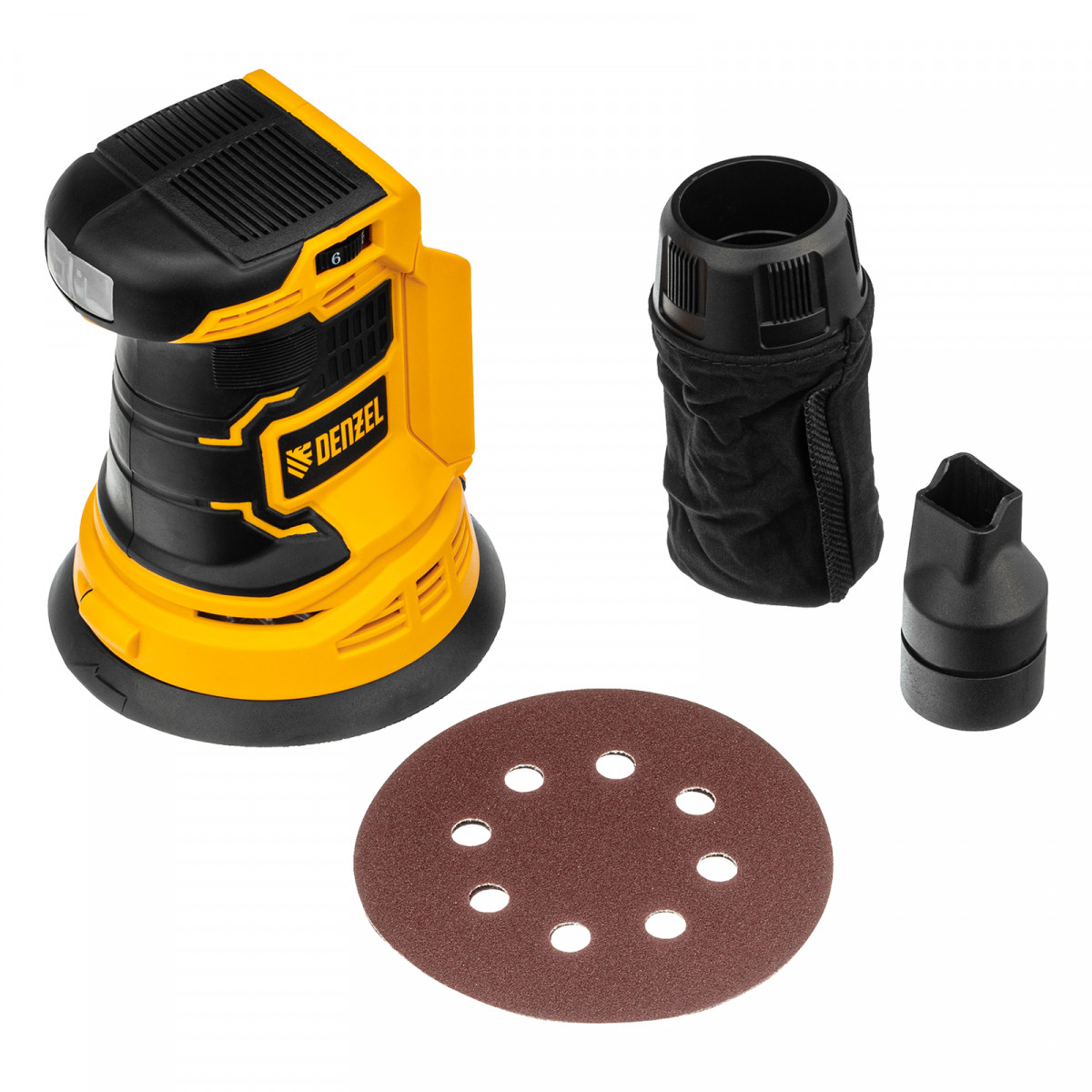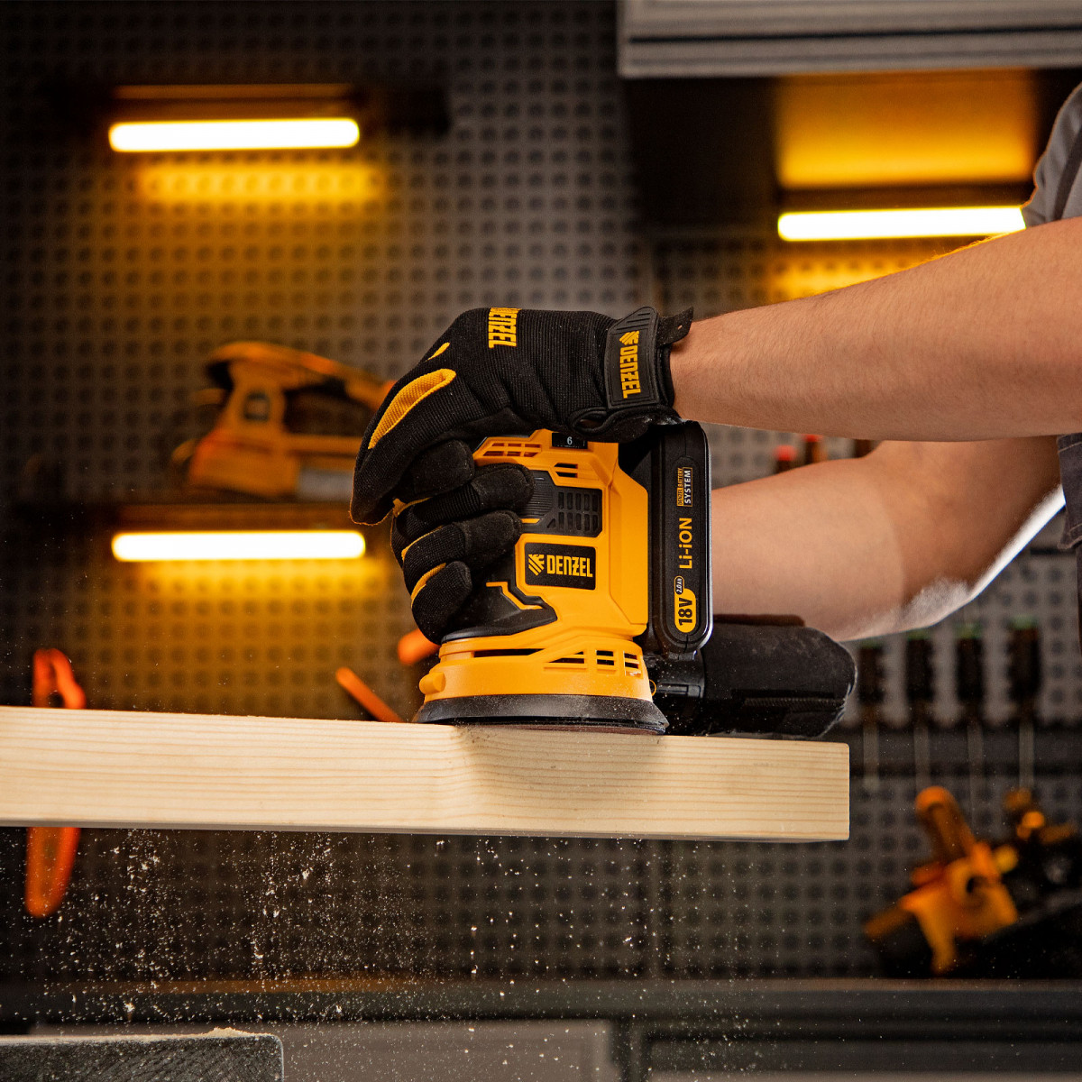 - Универсальность — к шлифовальной машине подходит аккумулятор 4Ач Li-ion, совместимый с любым инструментом 18V Denzel battery system серии IB (в комплект поставки не входит).