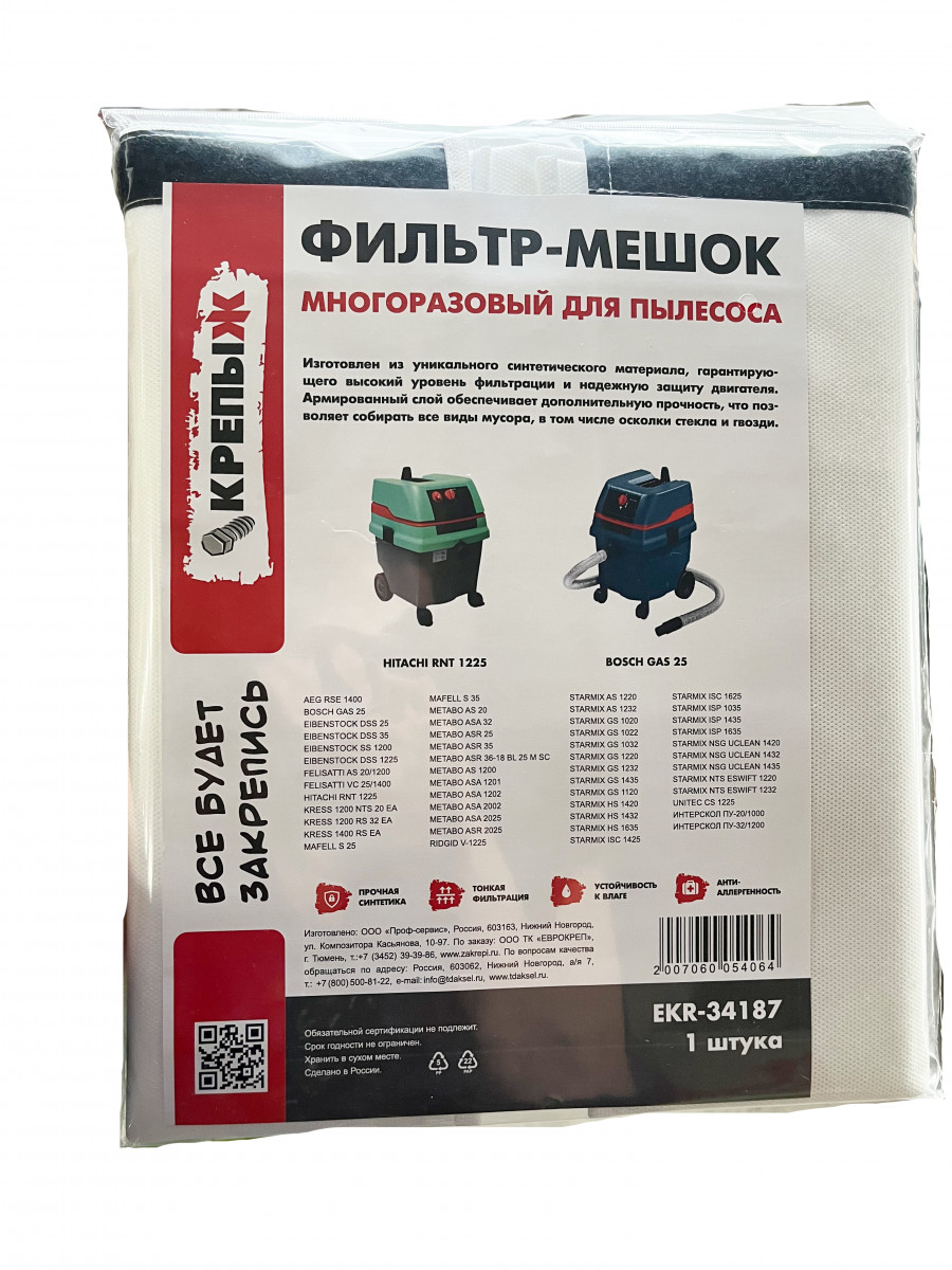 Мешок-пылесборник КРЕПЫЖ для пылесосов многоразовый синтетический EKR-34187 (до 36 л)