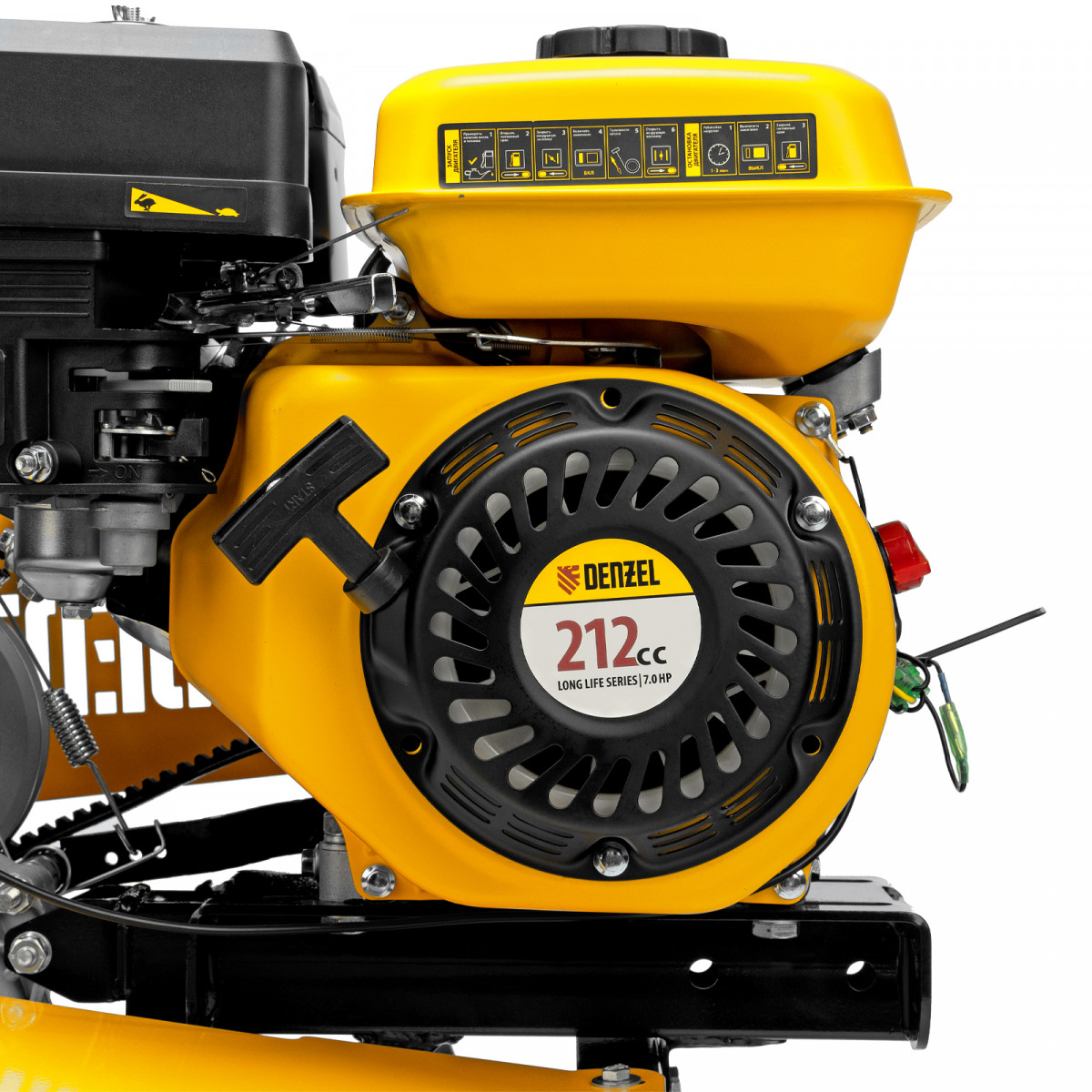 - Надежность — мощный и экономичный 4-тактный OHV-двигатель Denzel Long Life с воздушным охлаждением обеспечивает стабильную работу на протяжении длительного времени.