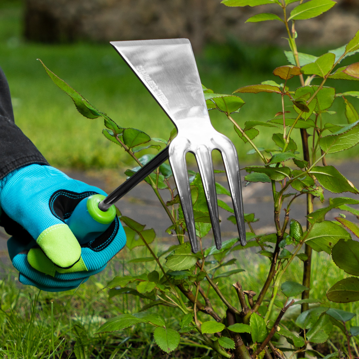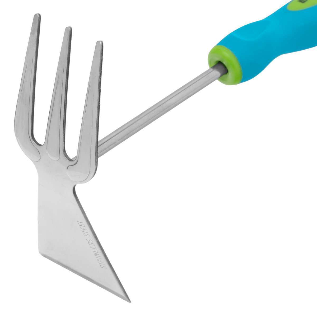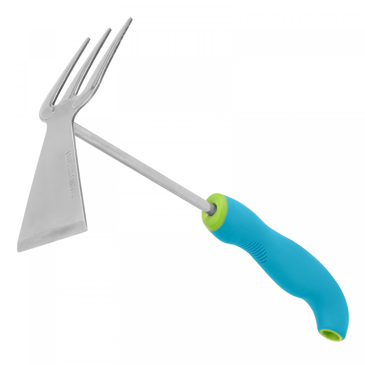 Комбинированная мотыжка Palisad PREMIUM PLUS 62055 из нержавеющей стали, 70 х 290 мм, с двухкомпонентной рукояткой, заменяет сразу два инструмента — рыхлитель и мотыгу. С ее помощью можно прополоть и разрыхлить почву, удалить мелкие сорняки, окучить растения, сформировать углубления под посадку семян. За счет небольших габаритов 70 х 290 мм мотыжка оптимально подходит для работ между рядами грядок, на клумбах с близко посаженными растениями и в труднодоступных местах.