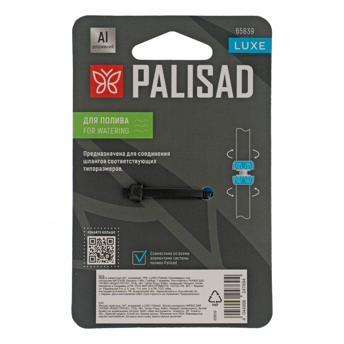 Муфта ремонтная алюминиевая Palisad LUXE 65839 позволяет соединить два шланга диаметром 3/4". С ее помощью можно удлинить поливочную линию или отремонтировать поврежденный участок шланга.