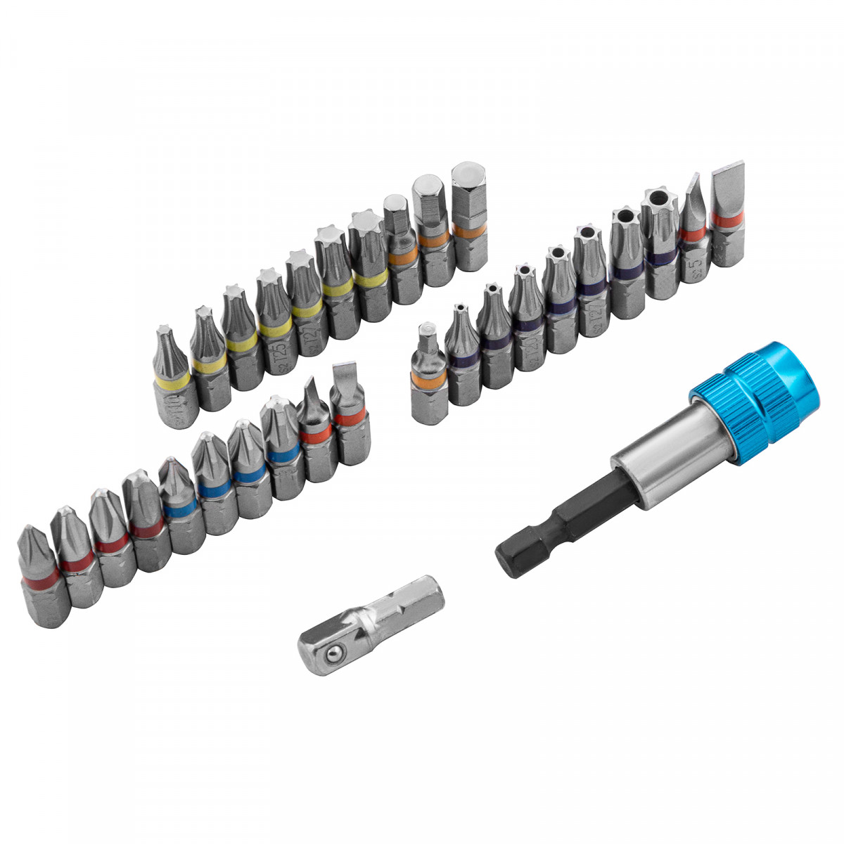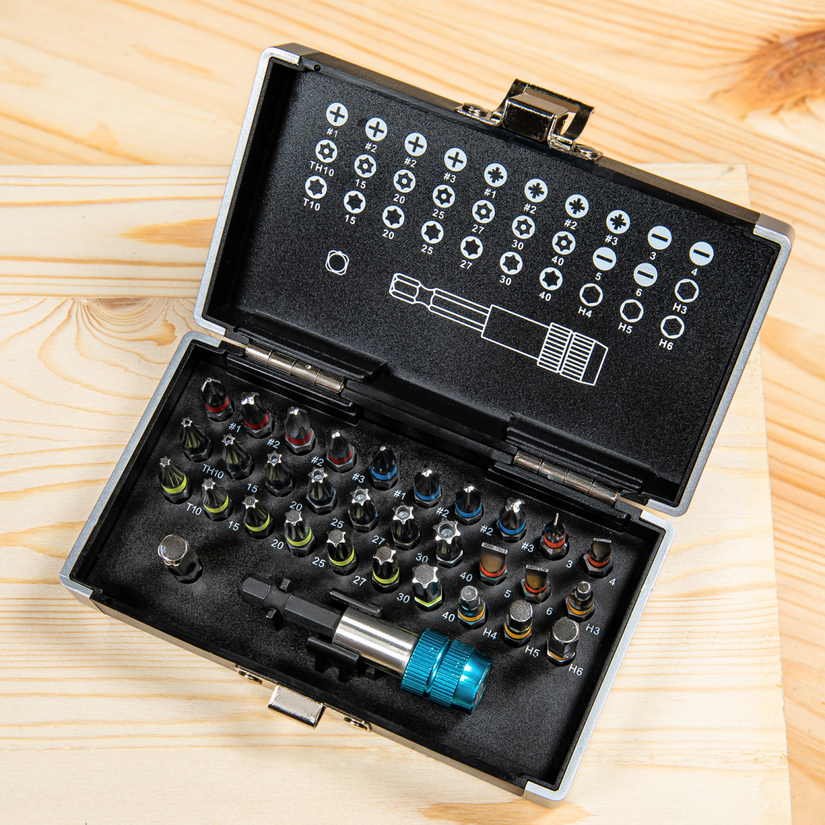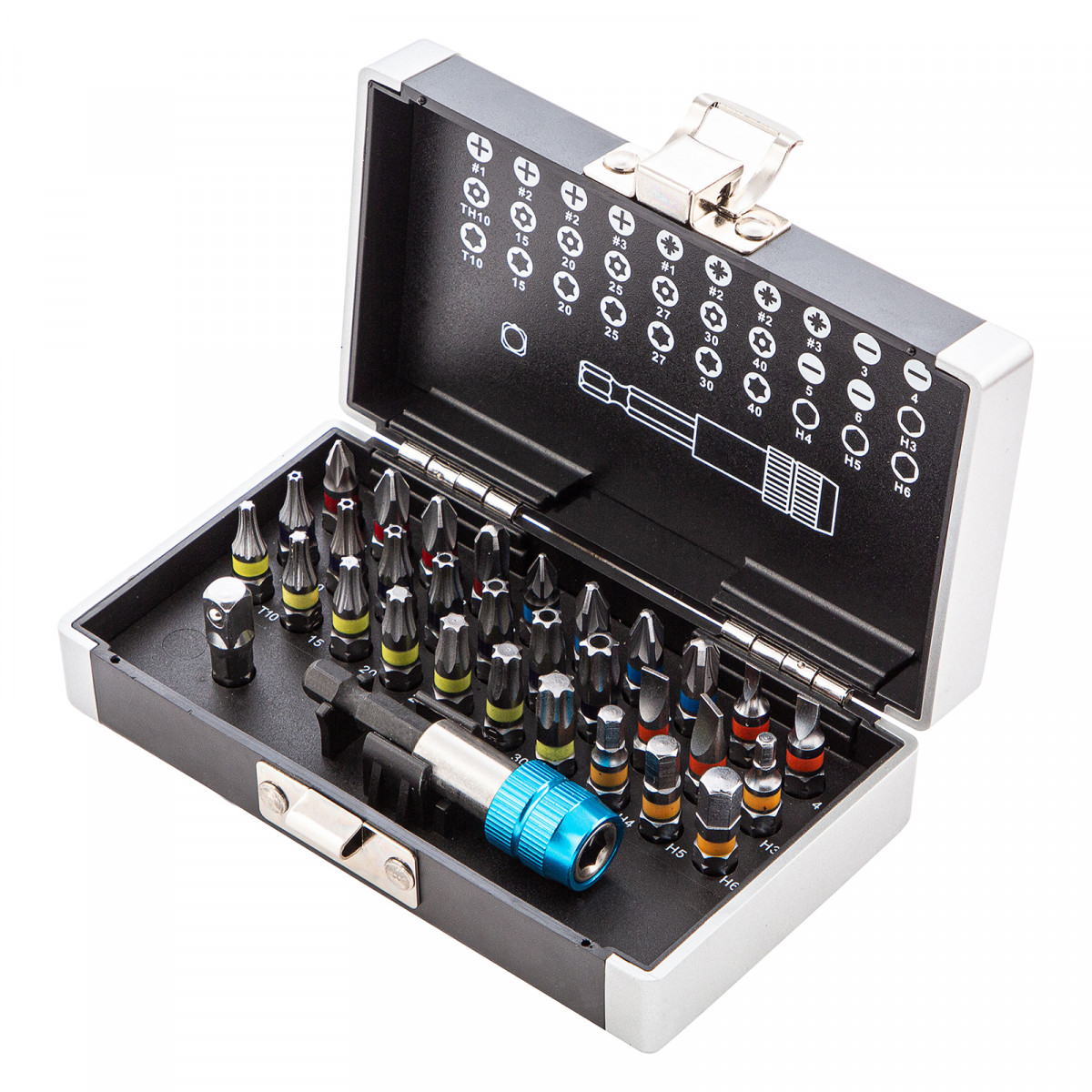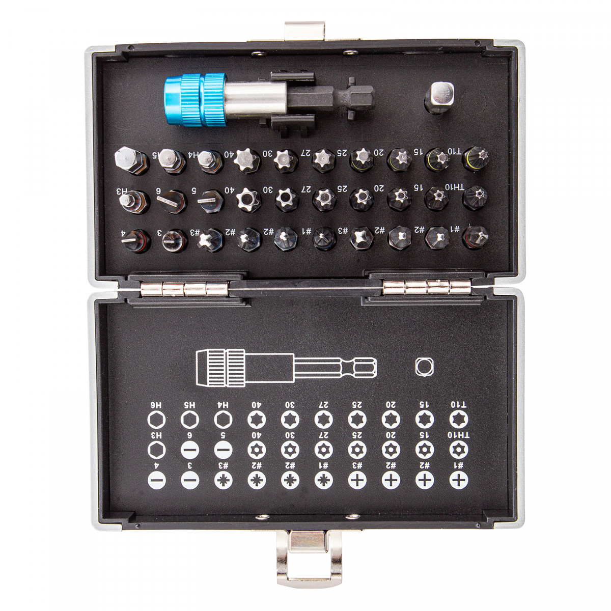 • Широкая комплектация — в одном наборе представлено 6 типов бит: PH и PZ калибров 1-3, SL калибров 3, 4, 5, 6, TORX и TORX Tamper (10, 15, 20, 25, 27, 30, 40), HEX 3-6