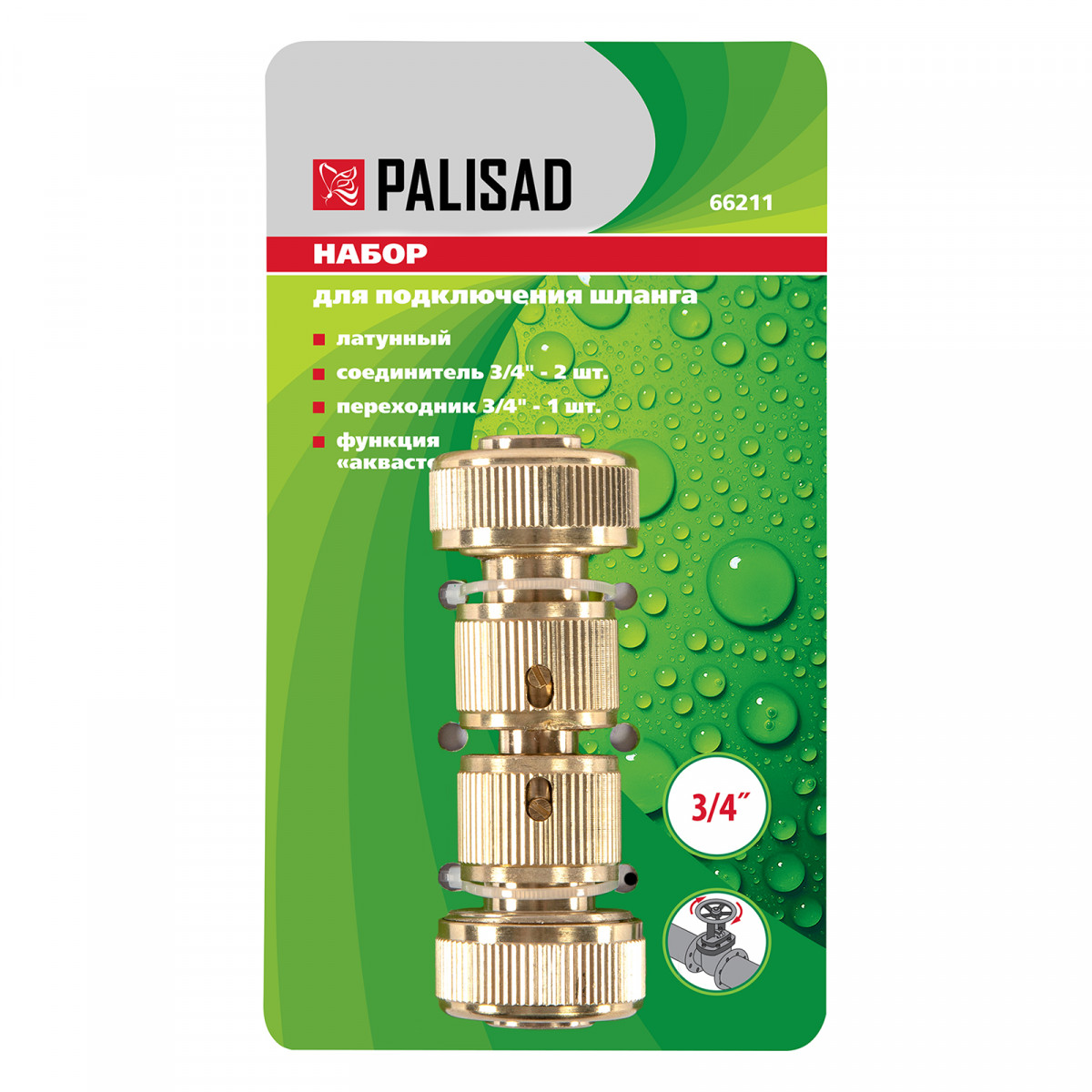 Набор для соединения шлангов 3/4, переходник, 2 соединителя, аквастоп, латунный Palisad