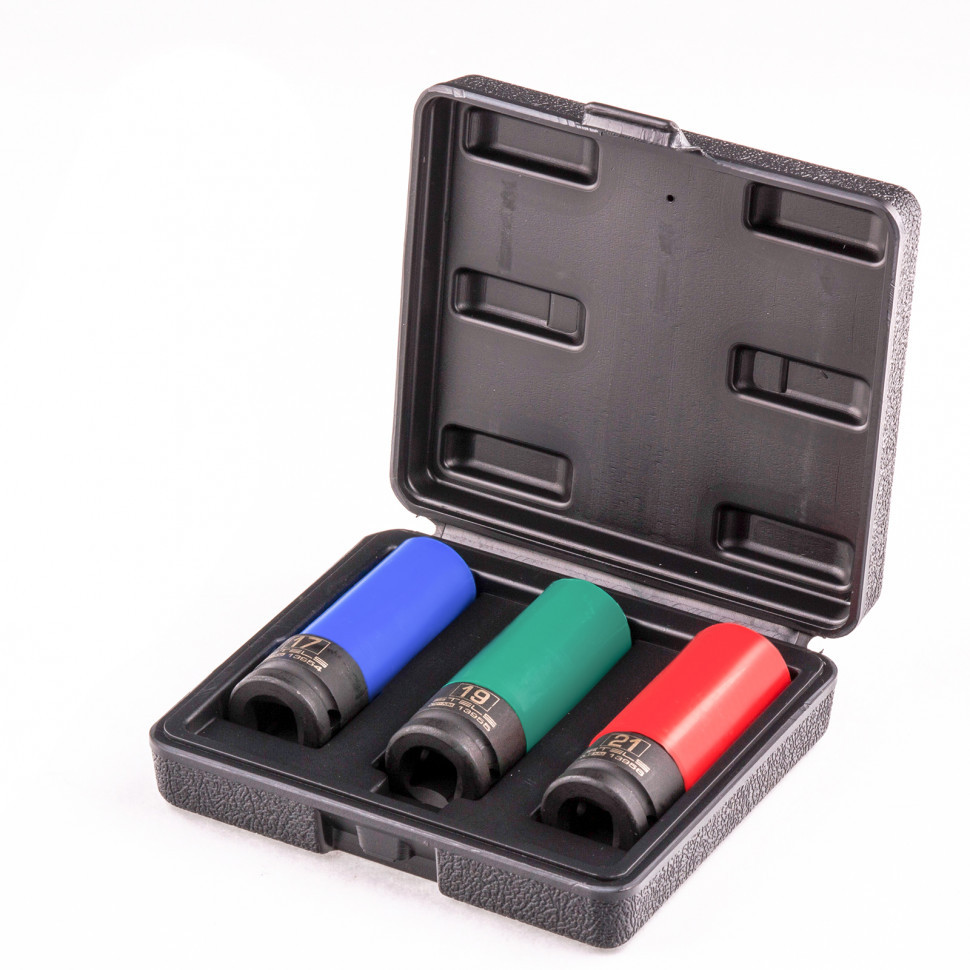 Головка ударная удлиненная для колесных дисков, 17 мм - 1 штГоловка ударная удлиненная для колесных дисков, 19 мм - 1 штГоловка ударная удлиненная для колесных дисков, 21 мм - 1 штПластиковый кейс - 1 шт