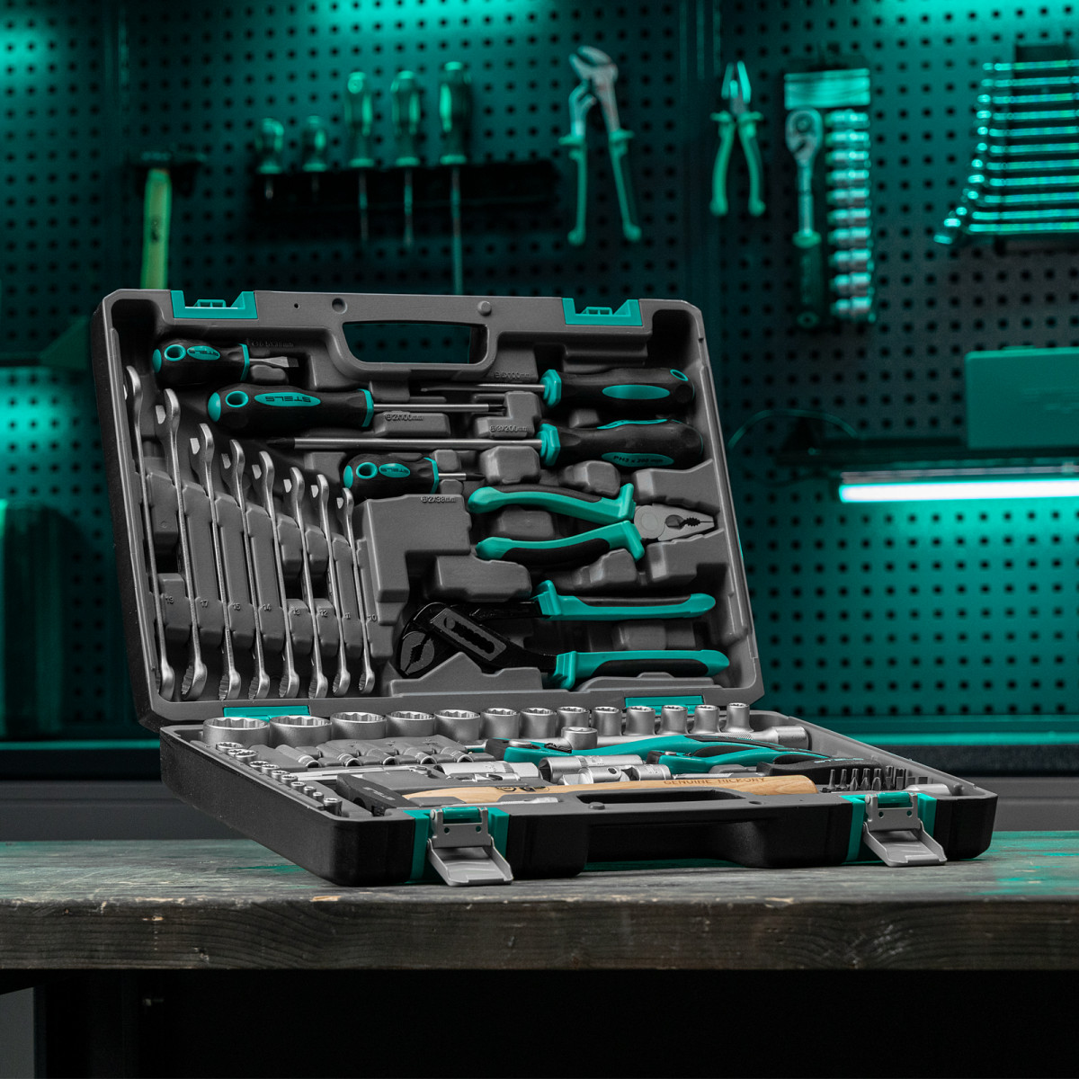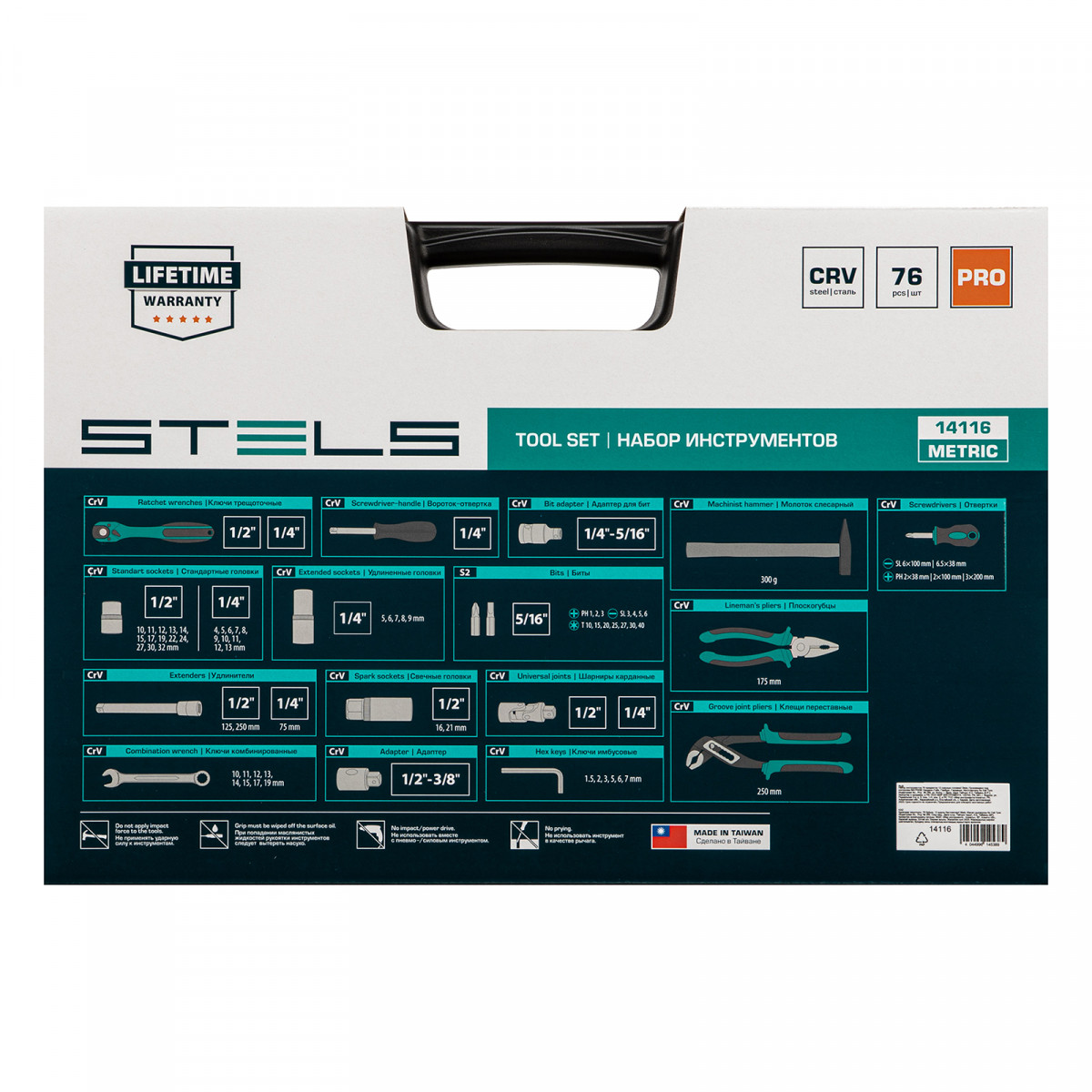 Набор инструментов Stels 14116 в ударопрочным пластиковом кейсе состоит из 76 предметов с присоединительными квадратами 1/2″ и 1/4″, из стали CrV и S2, и предназначен для выполнения слесарно-монтажных работ. Включает инструменты и насадки для работы с резьбовыми крепежами, в том числе 12-гранные торцевые головки и удлинители, облегчающие работу в труднодоступных местах. Молоток, плоскогубцы и переставные клещи расширяют возможности применения набора. Набор предназначен для профессионального использования в автомастерской, будет полезен и для решения бытовых задач.