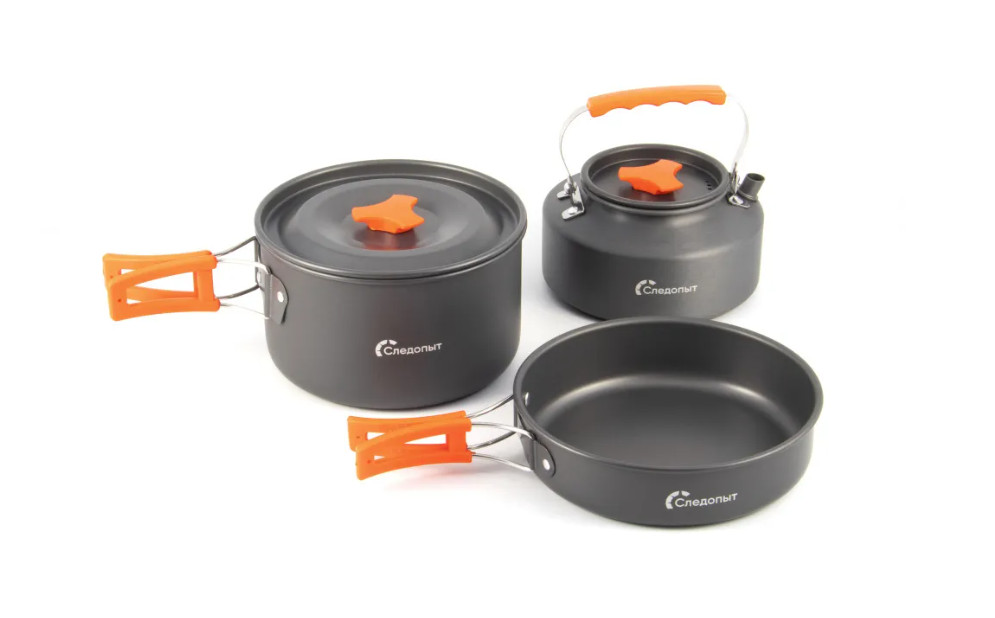 Набор кемпинговой посуды - изготовлен из анодированного алюминия, имеет усиленное плоское дно. Обладает высокой прочностью и сопротивляемостью к коррозии, что обеспечивает долгий срок эксплуатации.